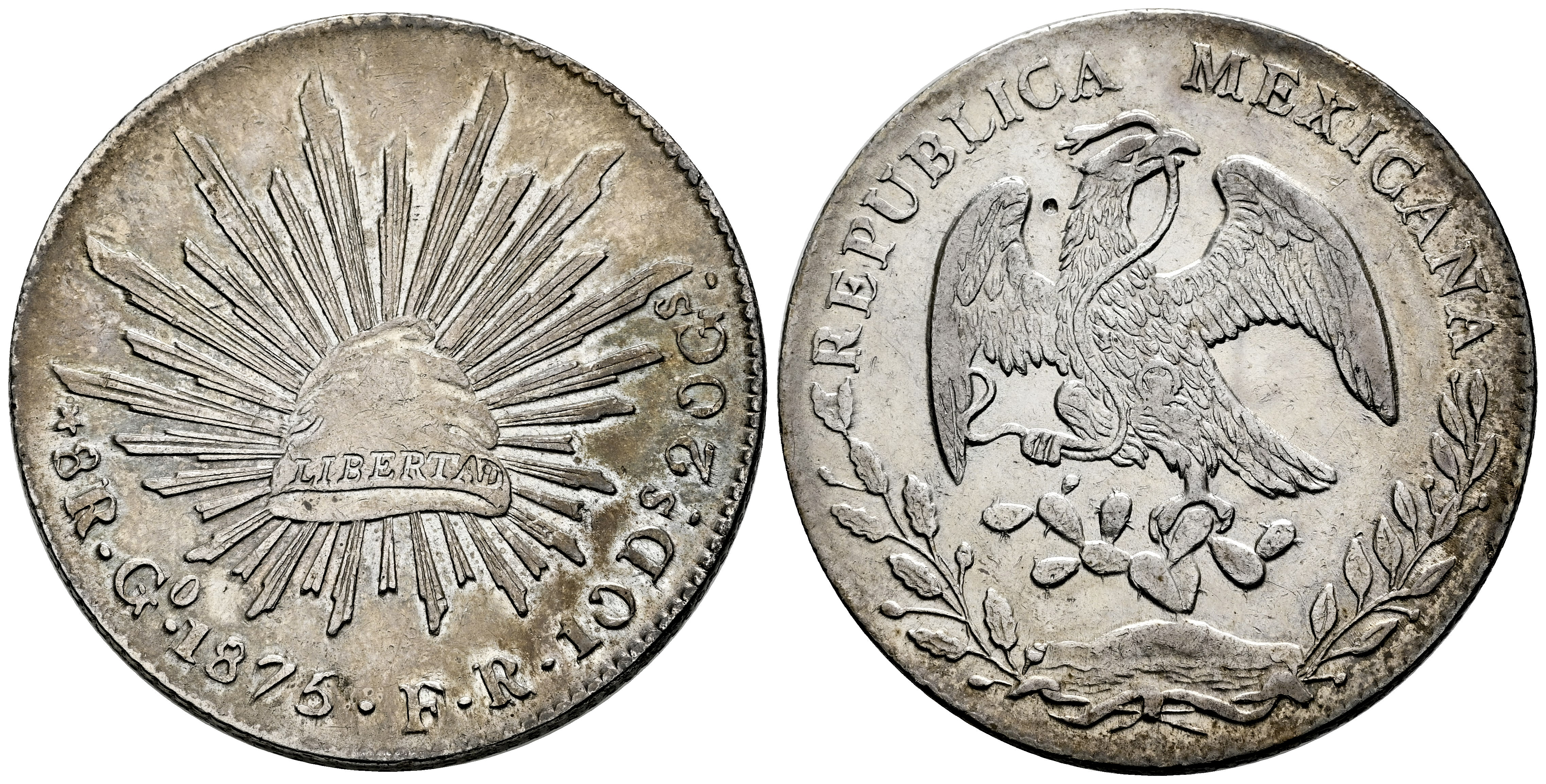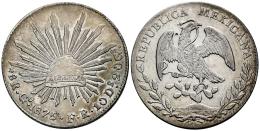 México. 8 reales. 1875. Guanajuato. FR. (Km-377.8). Ag. 26,98 g. Golpe de punzón en anverso. Ligeramente limpiada. MBC+. Est...60,00.