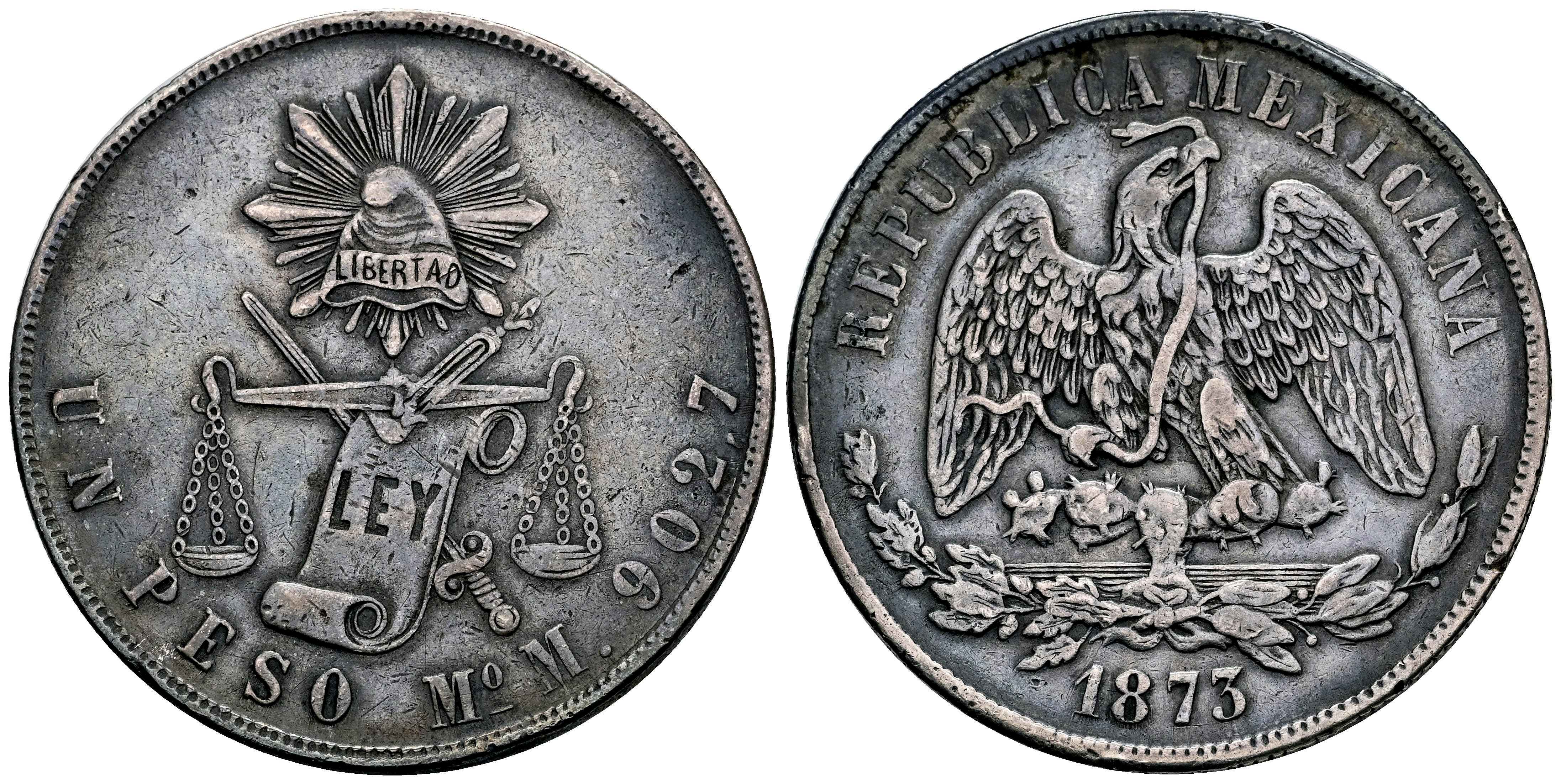 México. 1 peso. 1873. México. M. (Km-480.5). Ag. 26,95 g. Golpes en el canto. Pátina. MBC+. Est...60,00.