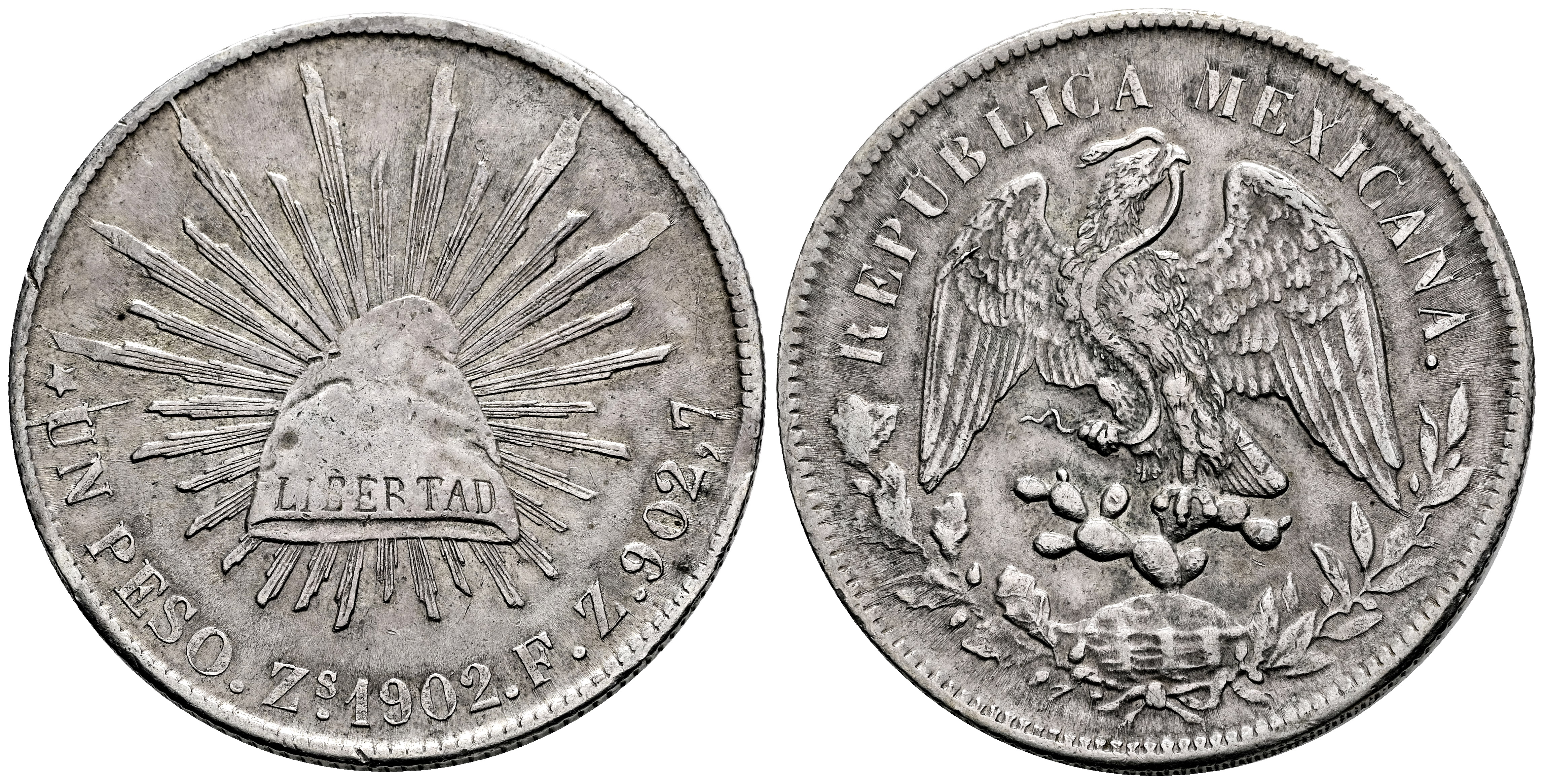 México. 1 peso. 1902. Zacatecas. FZ. (Km-409.3). Ag. 27,03 g. Pequeño defecto en canto. MBC+. Est...50,00.
