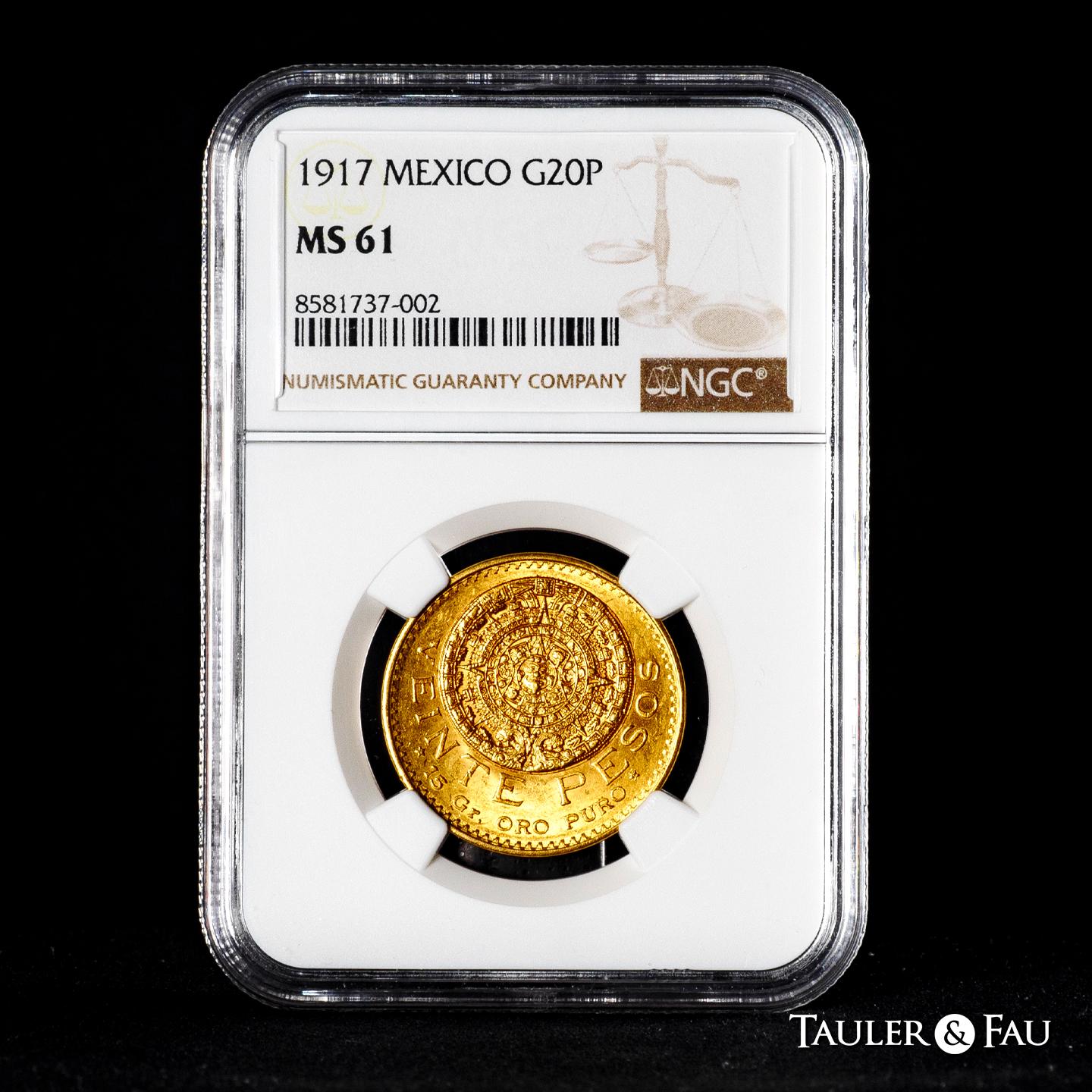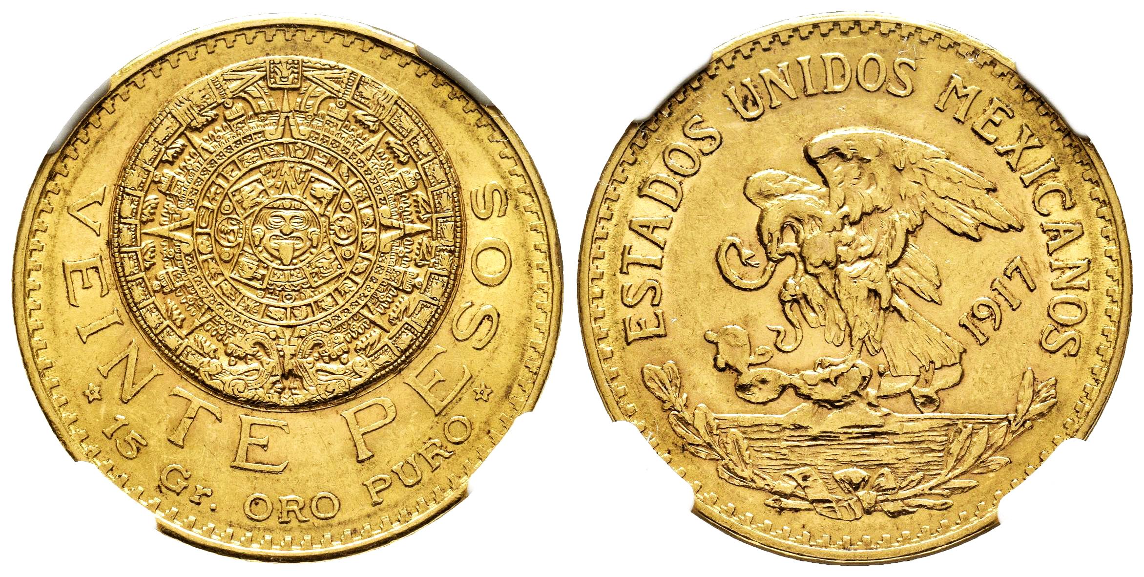 México. 20 pesos. 1917. México. (Km-478). Au. Encapsulada por NGC como MS 61. Est...2000,00.