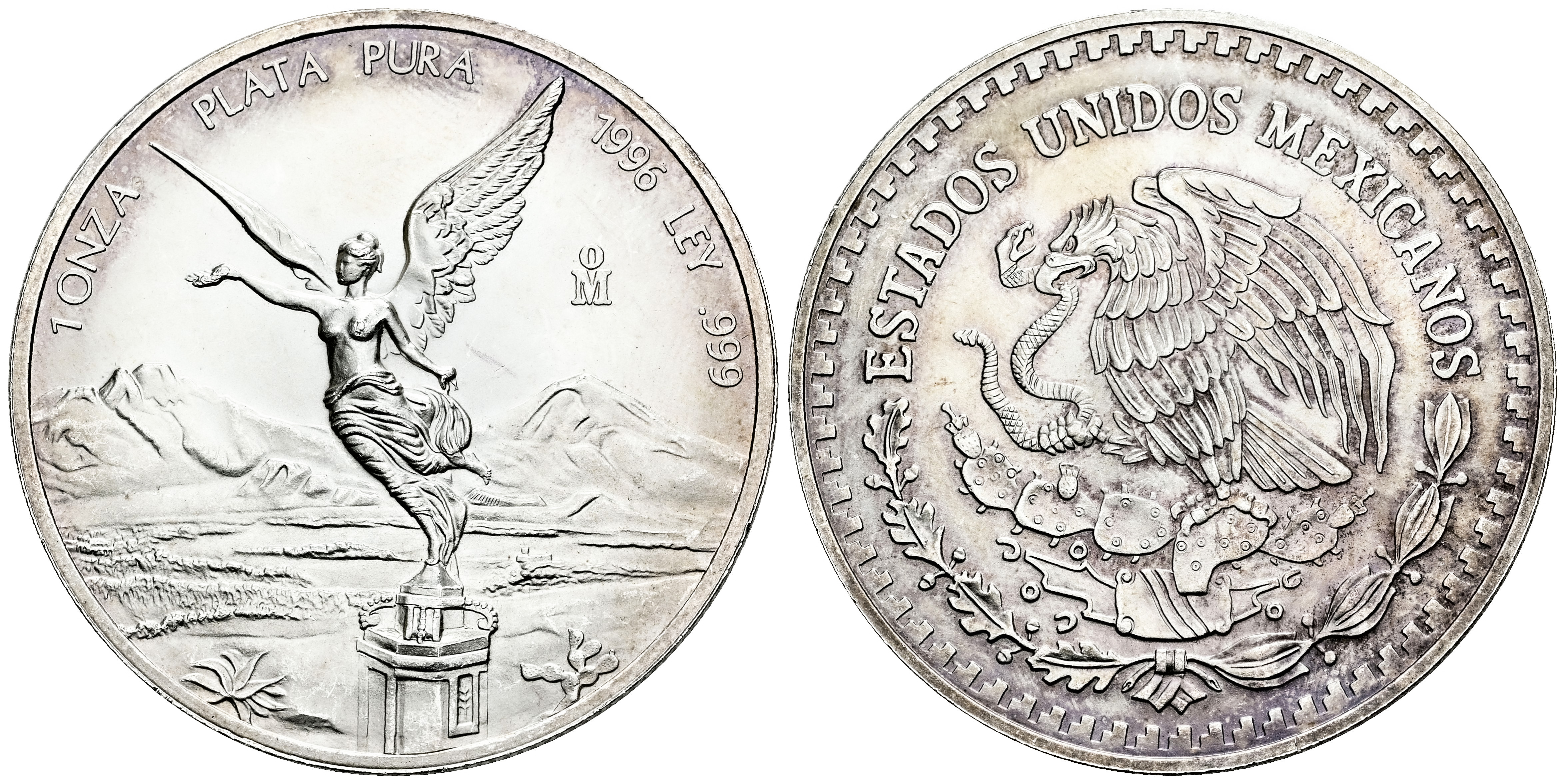 México. 1 onza. 1996. México. (Km-613). Ag. 31,04 g. Brillo original. Ligera pátina. Mínimas rayitas en anverso. SC-. Est...100,00.
