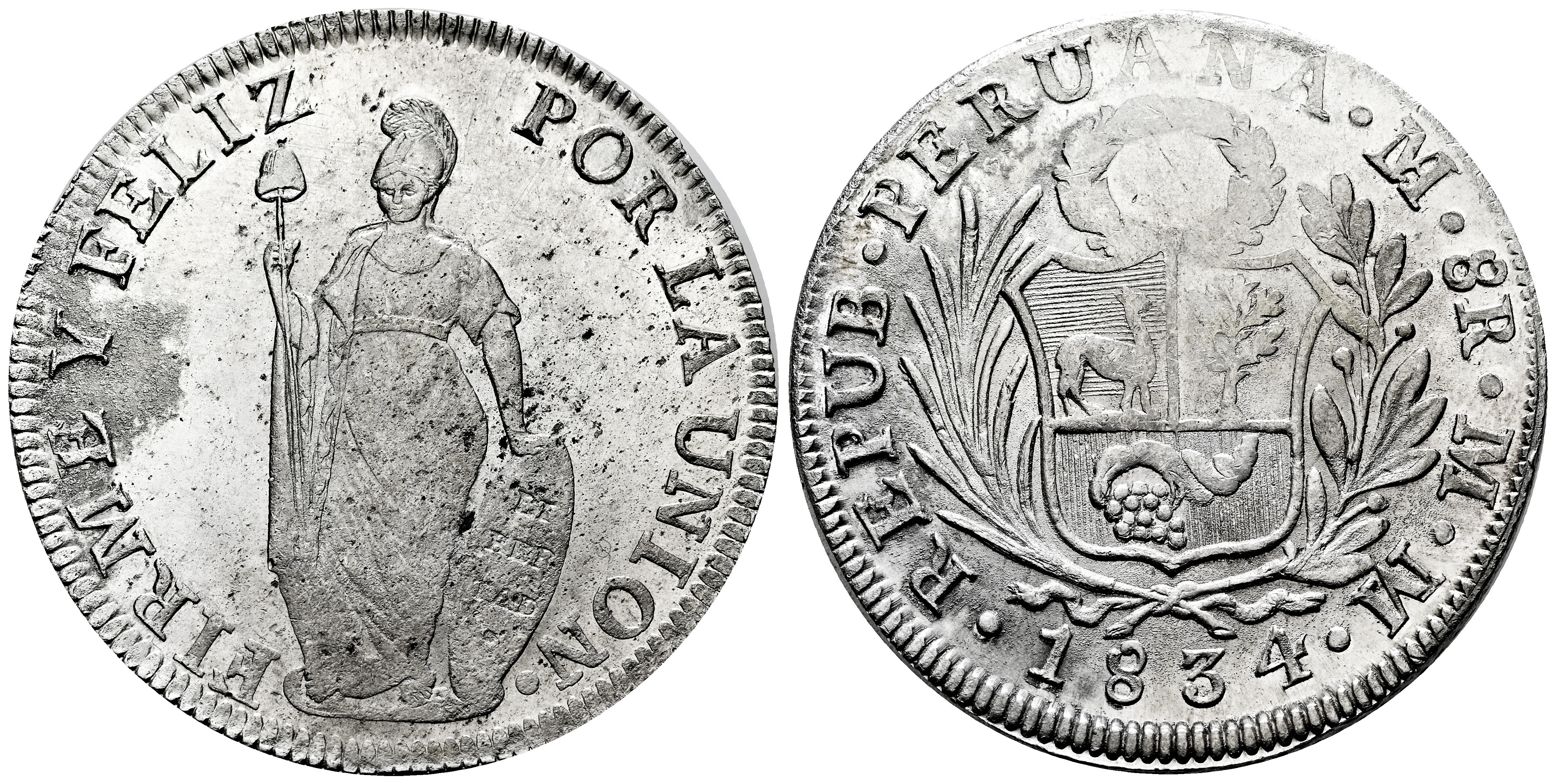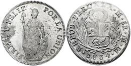 Perú. 8 reales. 1834. Lima. MM. (Km-142.3). Ag. 27,36 g. Defecto en el canto. Leves oxidaciones. Brillo original. EBC. Est...150,00.