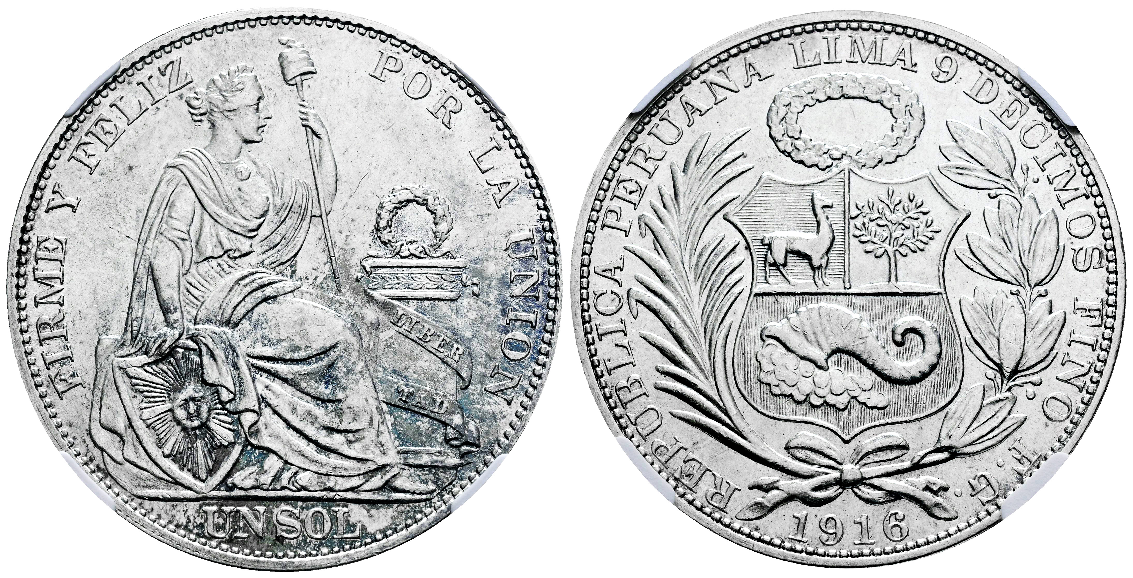 Perú. 1 sol. 1916. Lima. FG. (Km-196.26). Ag. Pleno brillo original. Encapsulada por NGC como MS 61. "LIBERTAD" en relieve. NGC-MS. Est...120,00.