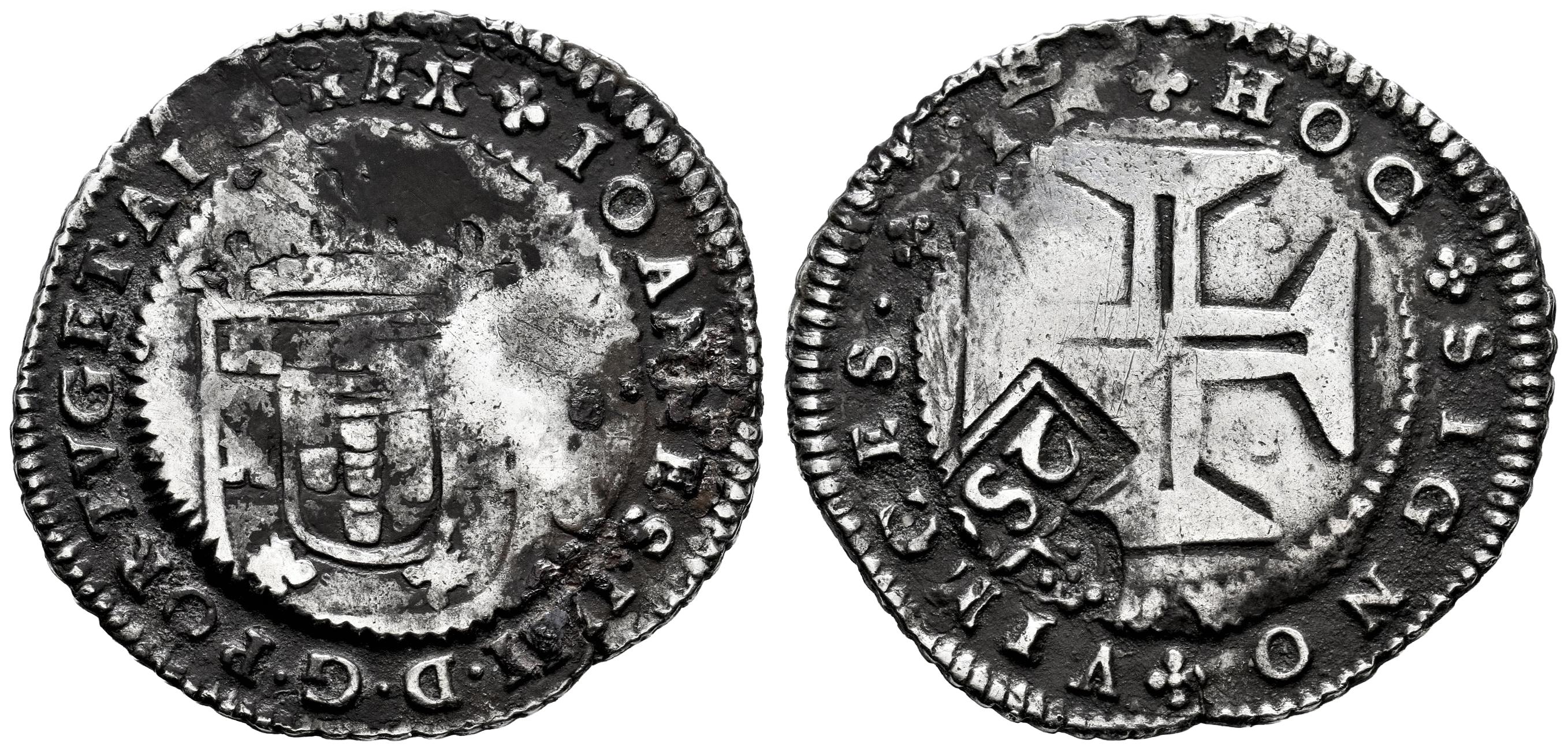 Portugal. D. Pedro II (1683-1706). 250 reis. Lisboa. (Gomes-101.01). Anv.: Orla B1: + IOANNES · III · D · G · PORTVG · ET · ALG · REX. Rev.: Orla 2: · + · IN + HOC + SIGNO + VINCES. Ag. 10,96 g. Resello/Carimbo de 250 Reis sobre 1/2 Cruzados de D. Joao IV (1640-1656). Rara. MBC. Est...400,00.