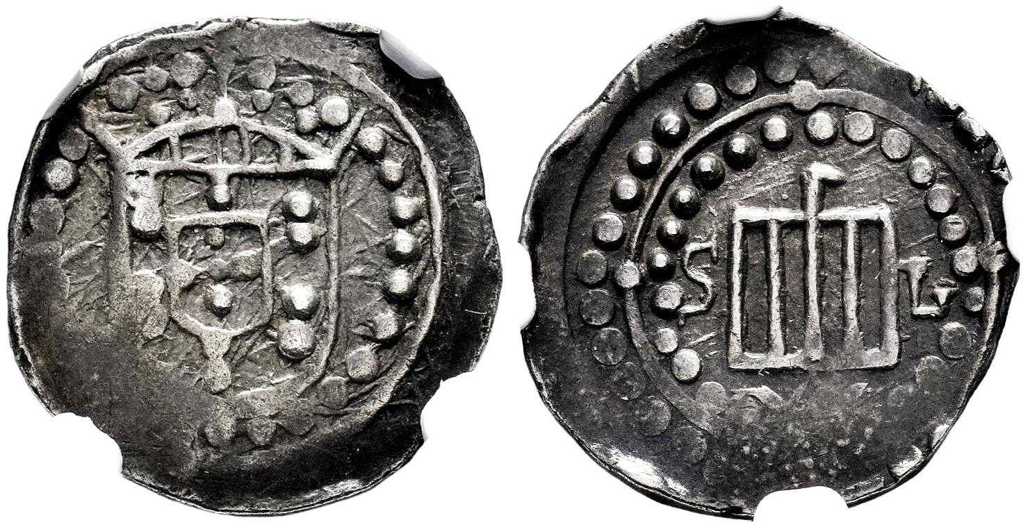 India Portuguesa. D. Felipe III de Portugal, IV de España (1621-1640). 1 tanga. ND. Ceylan. (Gomes-14.01). Rev.: S-L Parrilla de San Lorenzo (Grelha de S. Lourenço). Ag. Buen ejemplar. Encapsulada por NGC como AU 55 (Top Pop), el mejor ejemplar conservado en el censo de NGC. NGC-AU. Est...600,00.
