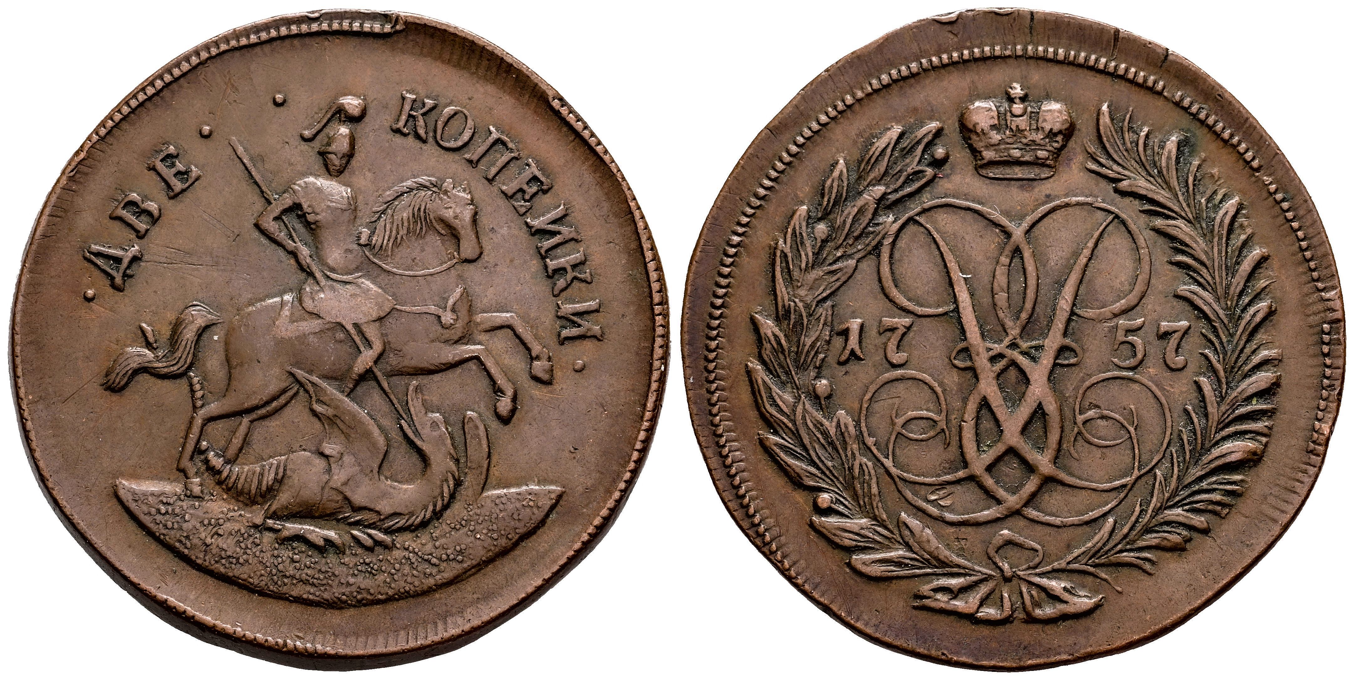 Rusia. Elizabeth (1741-1762). 2 Kopejek. 1757. Ekaterinburg. Novodel. (Bitkin-H464). Ae. 20,77 g. Rara. MBC. Est...300,00.