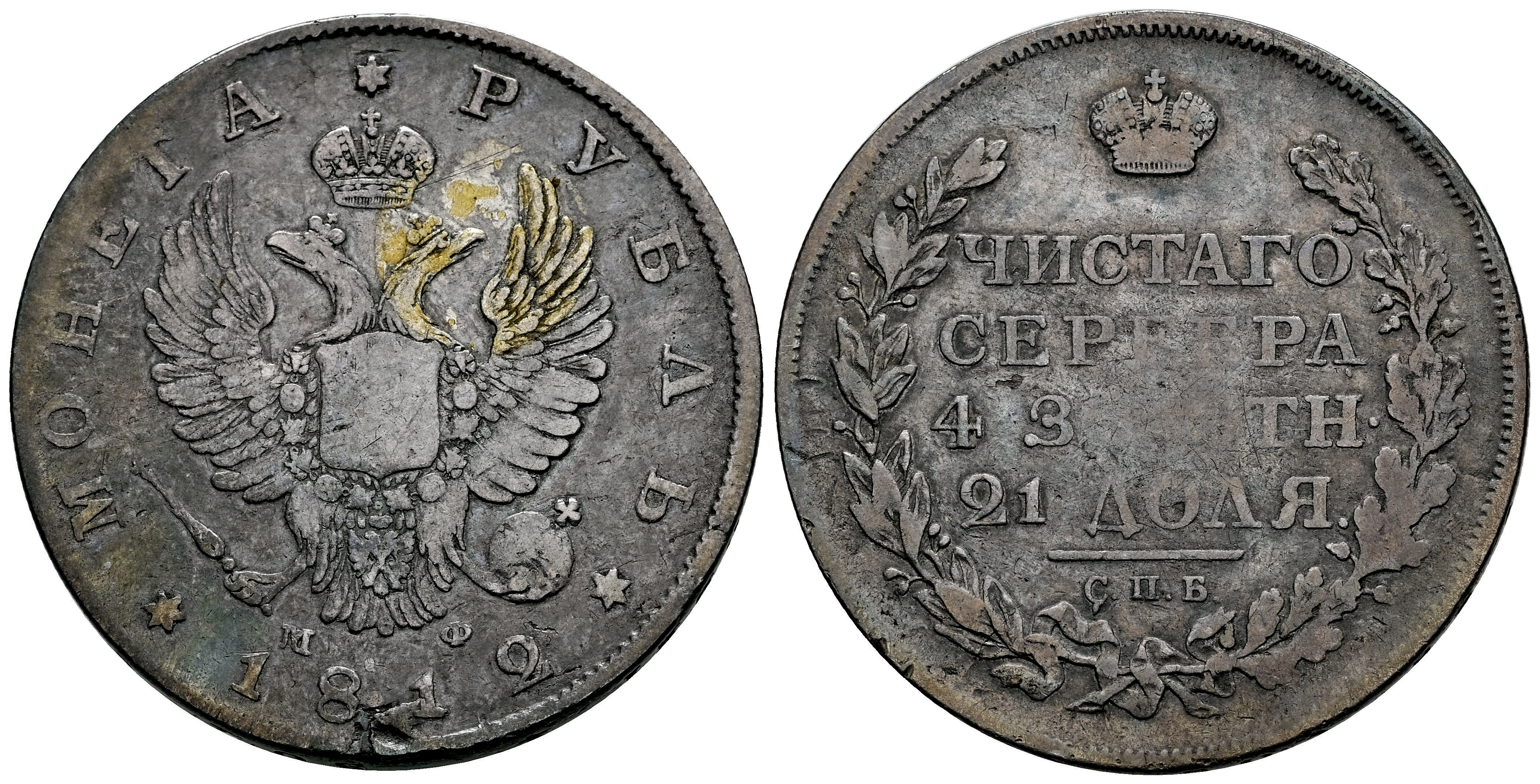 Rusia. Alexander I. 1 rouble. 1812. San Petesburgo. СПБ-МФ. (Km-C#130). (Bitkin-103). Ag. 20,41 g. Golpe en canto. MBC-/BC+. Est...40,00.