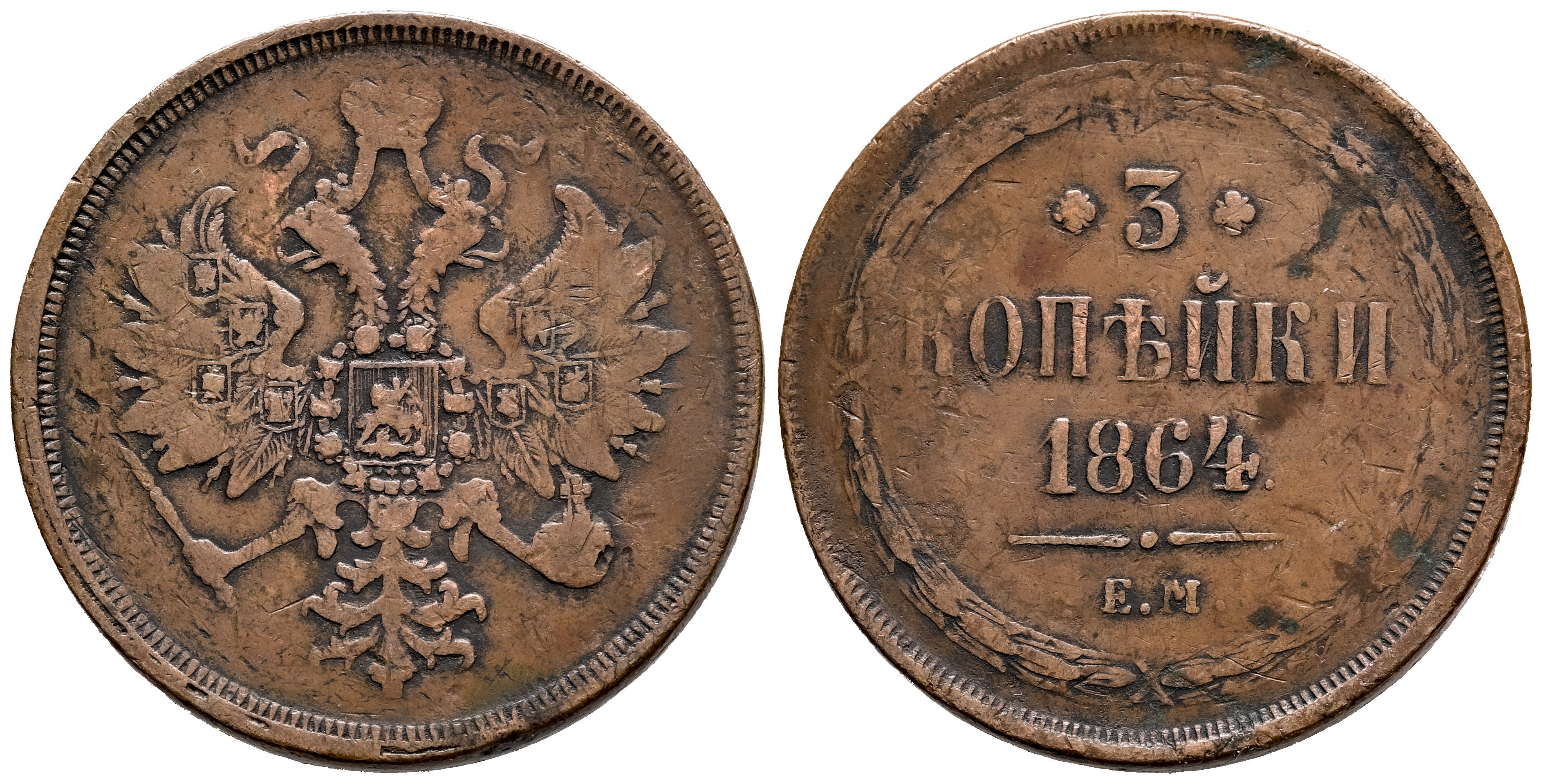 Rusia. Alexander II (1855-1881). 3 kopeks. 1864. Ekaterinburg. EM. (Km-Y#5a.1). (Bitkin-328). Ae. 14,63 g. MBC-. Est...25,00.