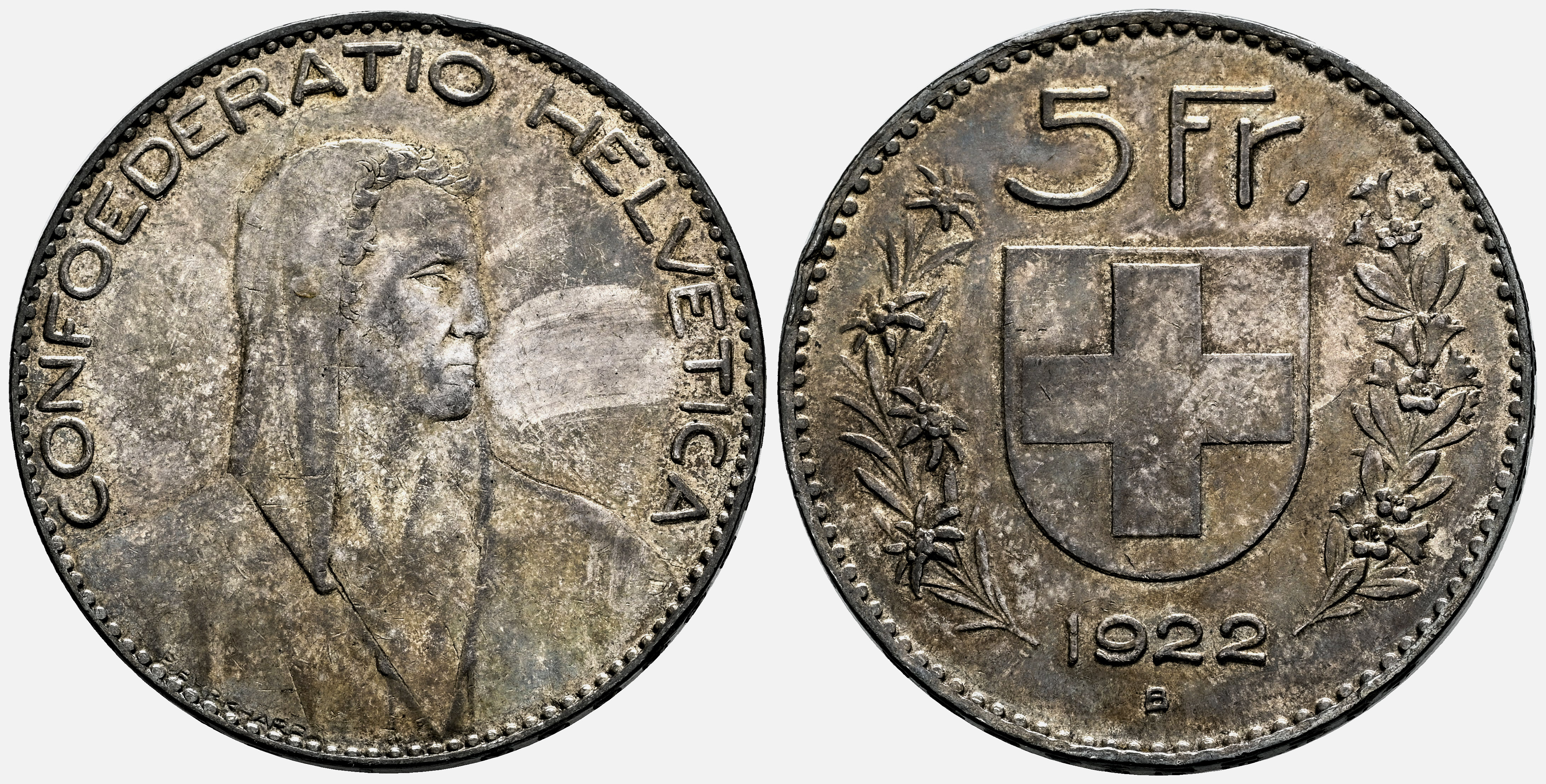 Suiza. 5 francs. 1922. Berna. B. (Km-37). Ag. 24,96 g. Golpecitos en canto. Suave pátina. EBC-. Est...50,00.