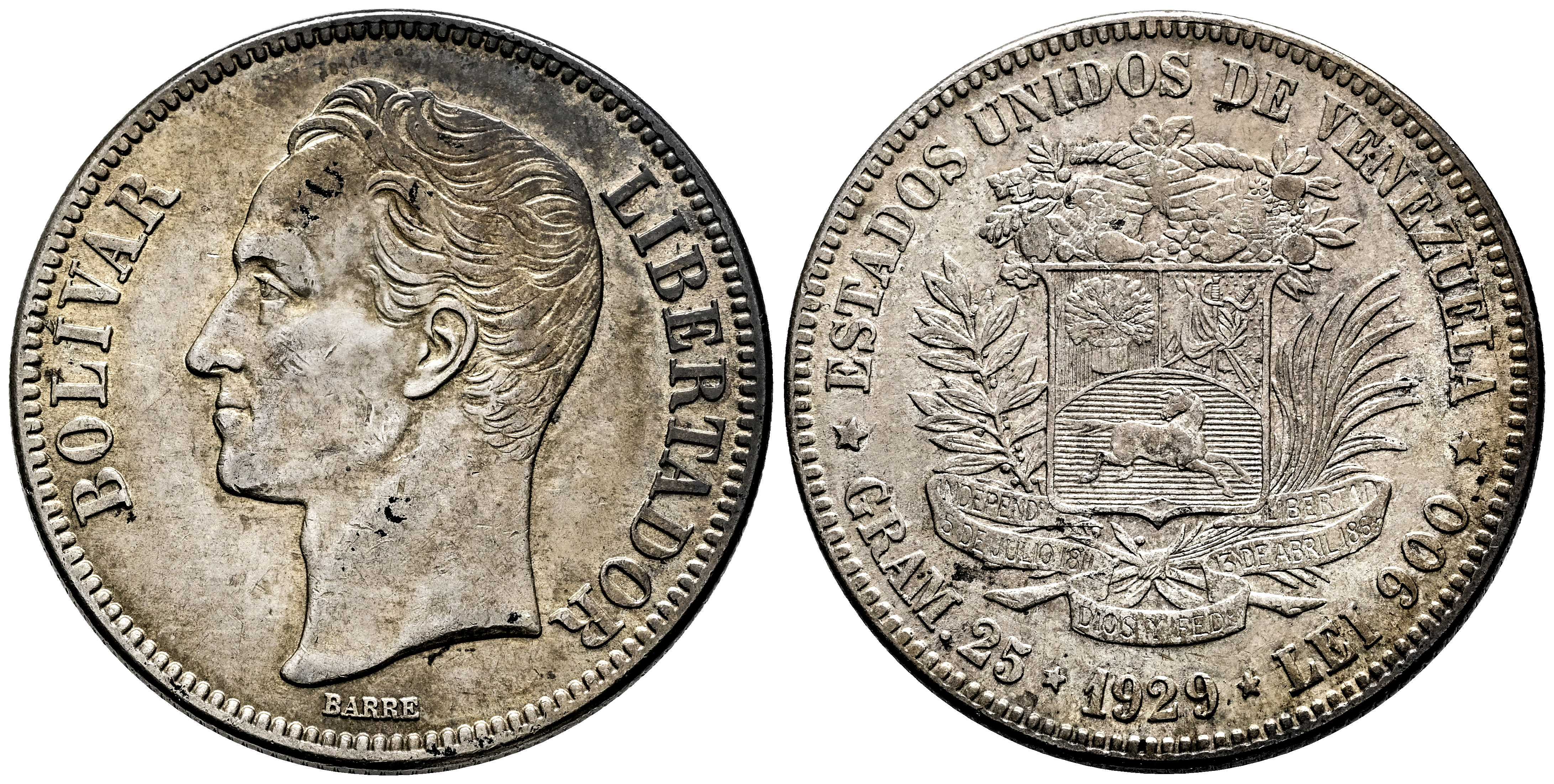México. 5 bolívares. 1929. Philadelphia. (Km-Y#24.2). Ag. 25,02 g. Marquitas. Pátina. MBC+/EBC-. Est...60,00.