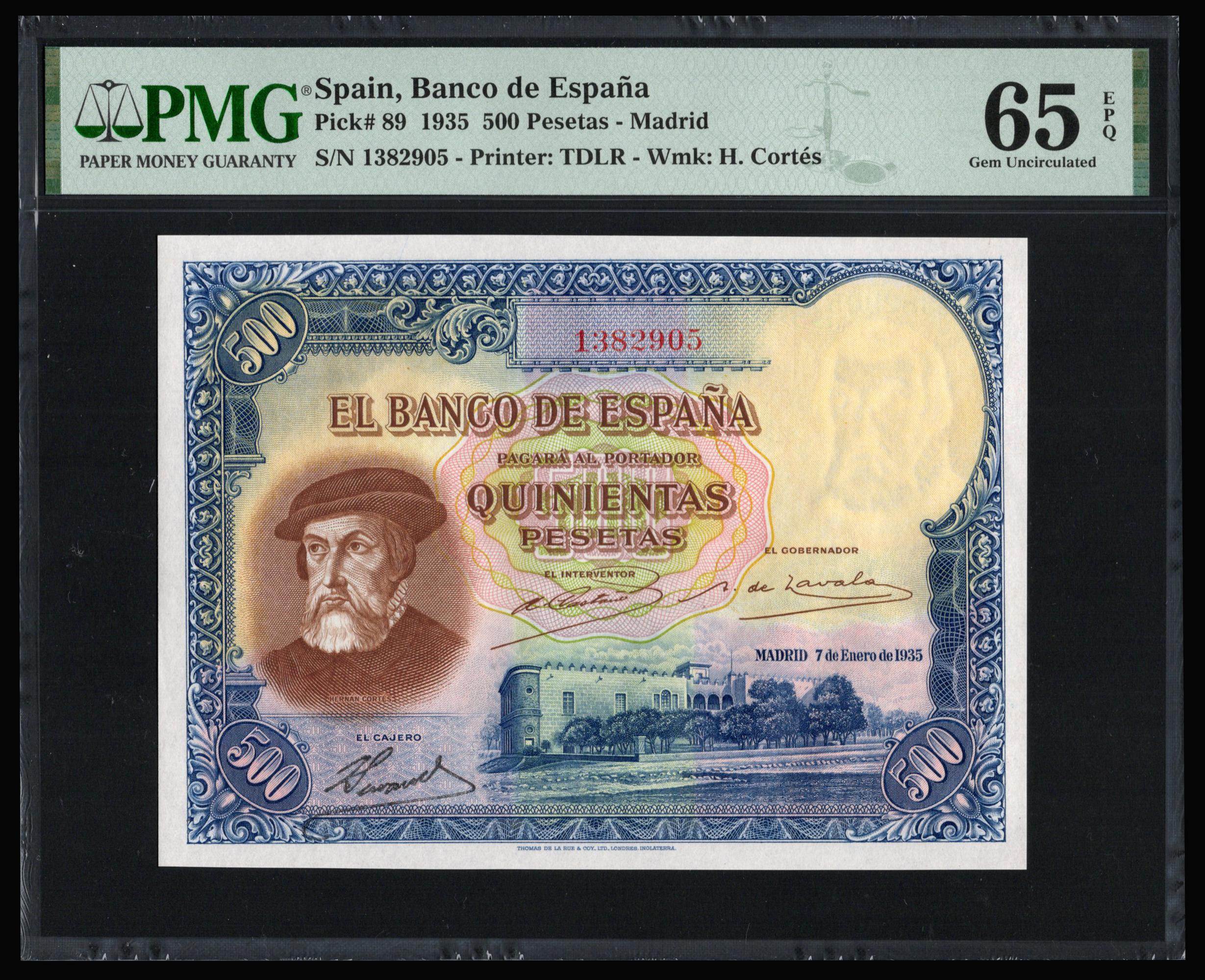 500 pesetas. 1935. Madrid. (Ed-365). (Pick-89). 7 de enero, Hernán Cortés. Sin serie. Encapsulado por PMG como 65 EPQ (Gem Uncirculated). Est...600,00.
