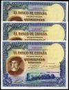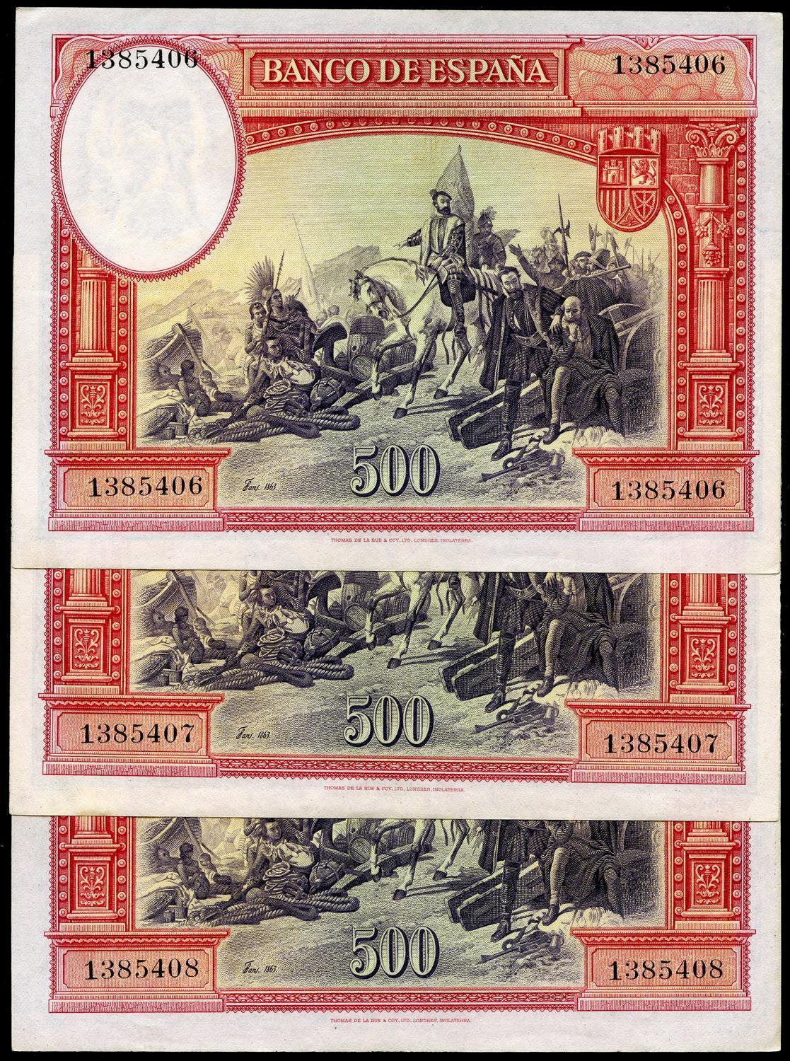 500 pesetas. 1935. Madrid. (Ed 2017-365). 7 de enero, Hernán Cortés. Sin serie. Trio correlativo todos con doblez central y uno de ellos con rotura en el margen superior. Muy raro. EBC-. Est...1000,00.