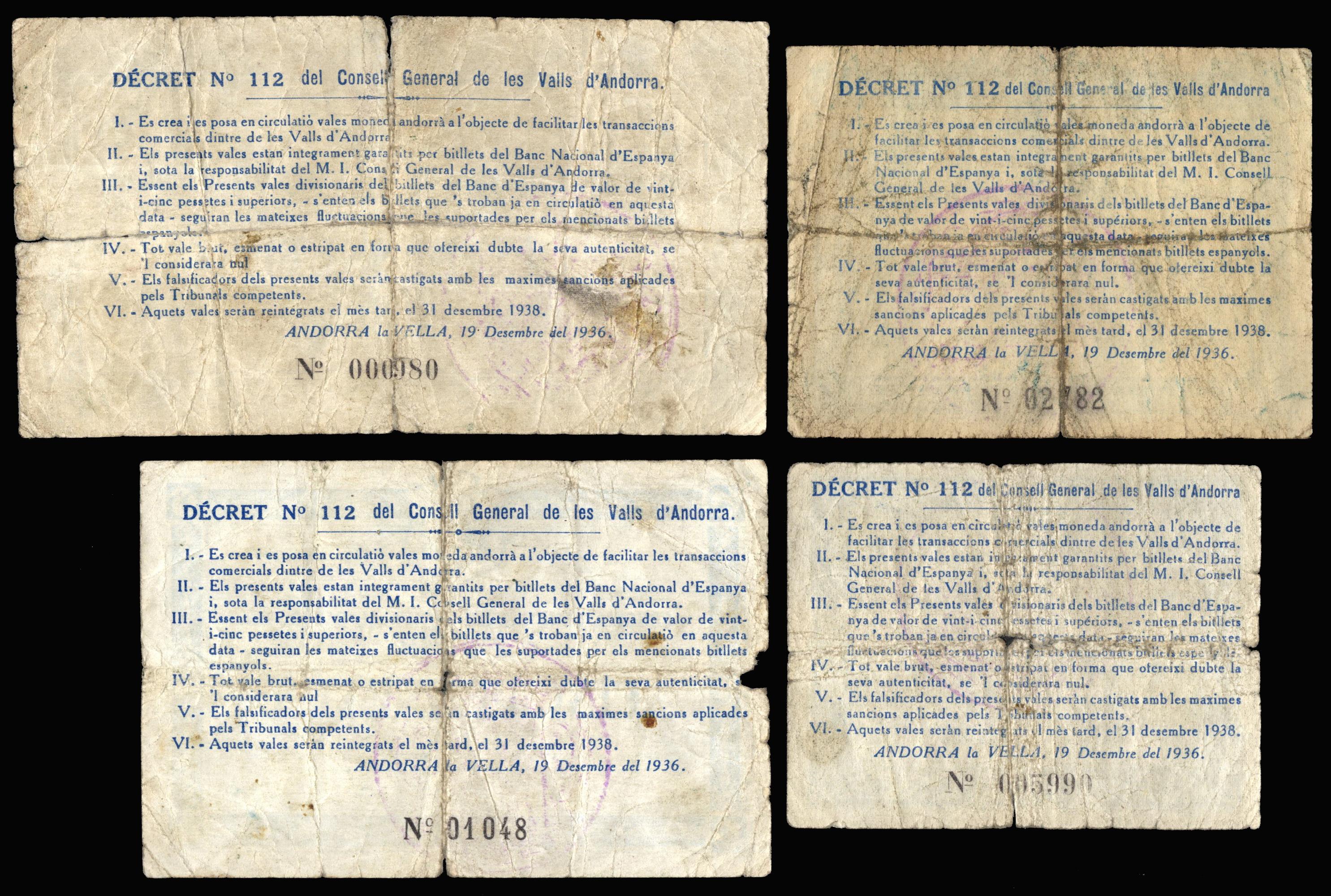 Andorra. 1936 (Ed-2, 4, 6 y 8). 1, 2, 5 y 10 pesetas. Serie azul. Todos con roturas y dobleces. BC. Est...450,00.