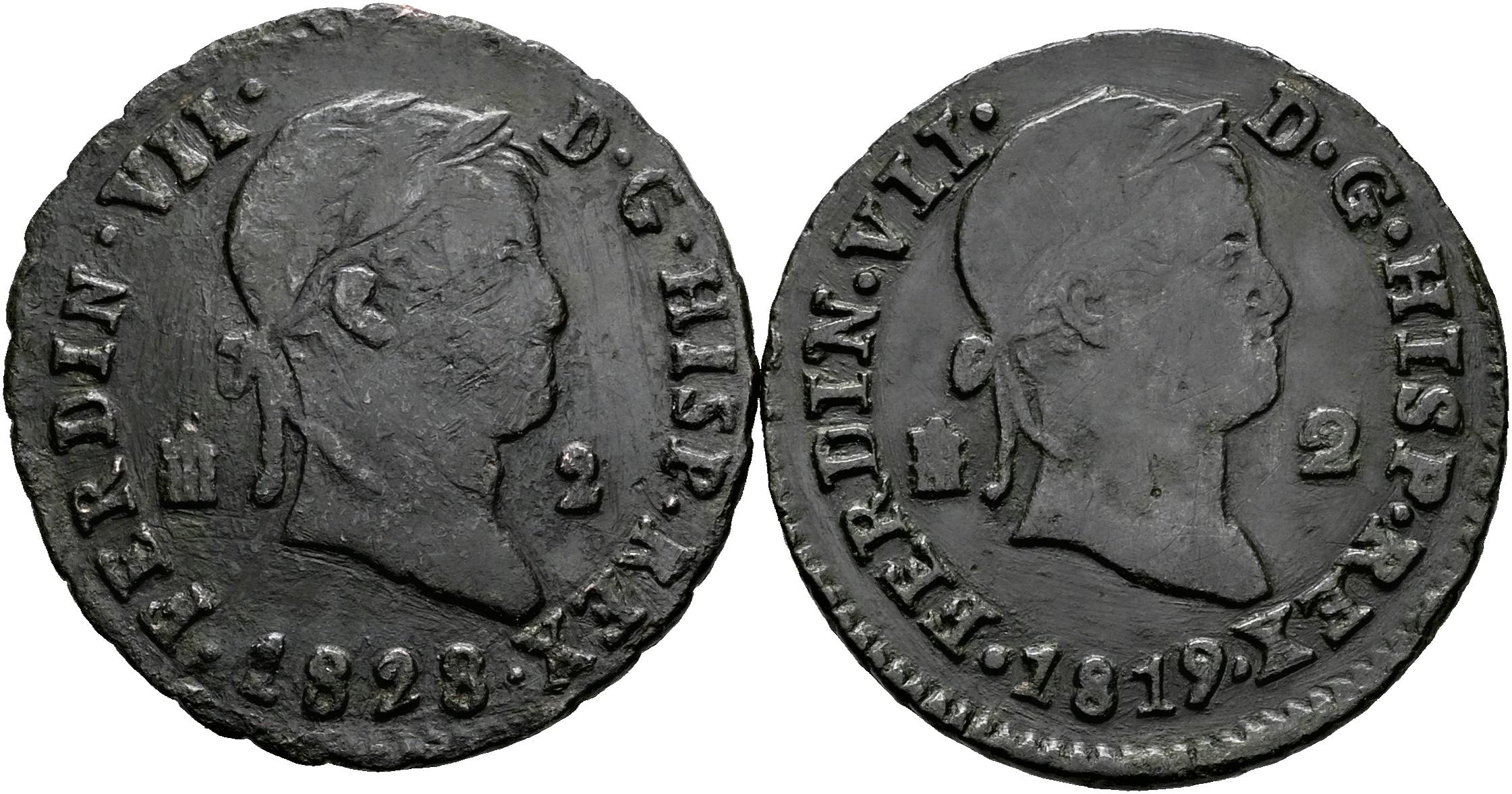 Lote de 2 monedas de 2 maravedís de Segovia Fernando VII; 1819 y 1828. Es imprescindible un riguroso examen. SOLO ENVÍO A ESPAÑA PENÍNSULA. NO SE ADMITE DEVOLUCIÓN. MBC+. Est...35,00.