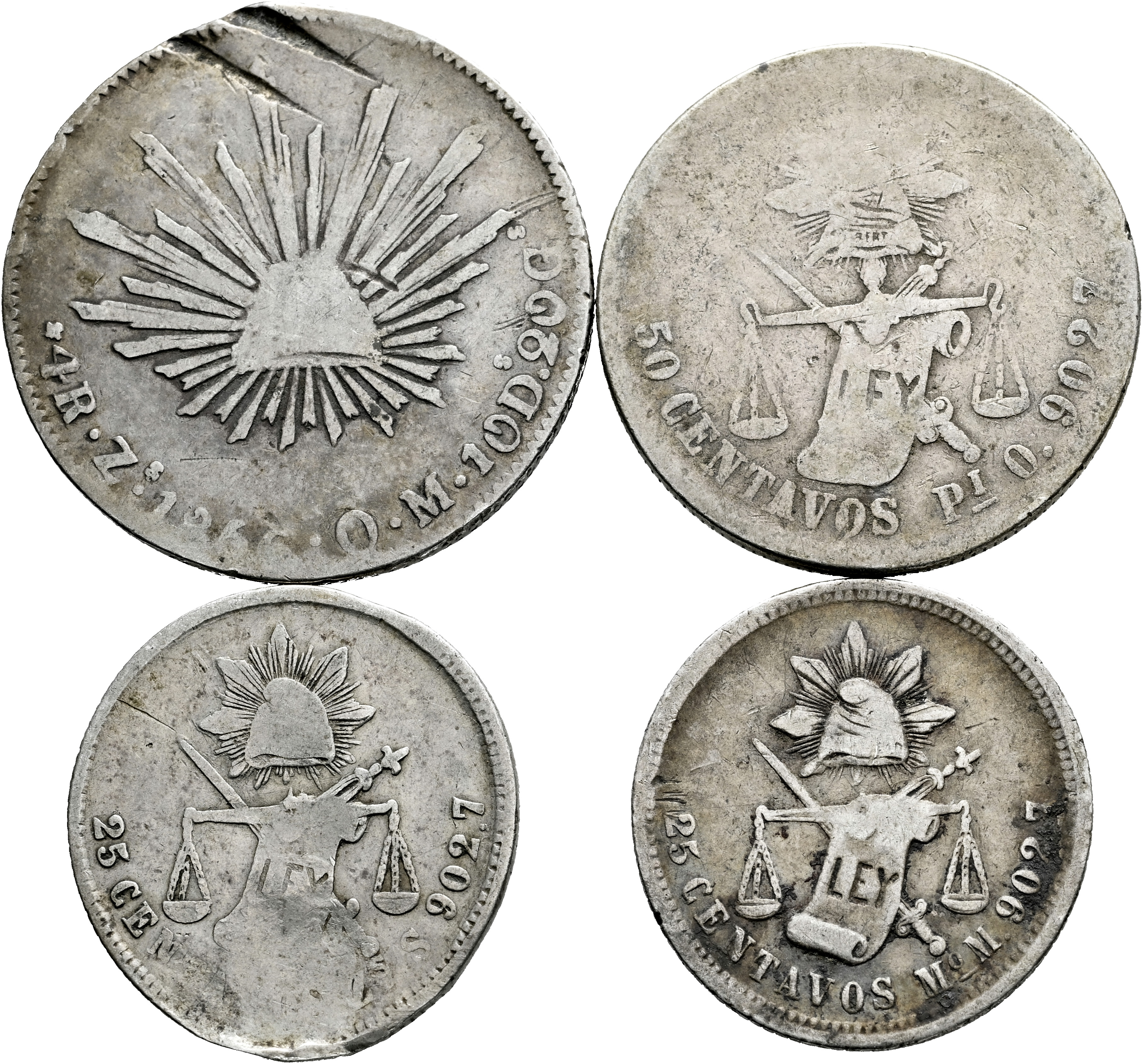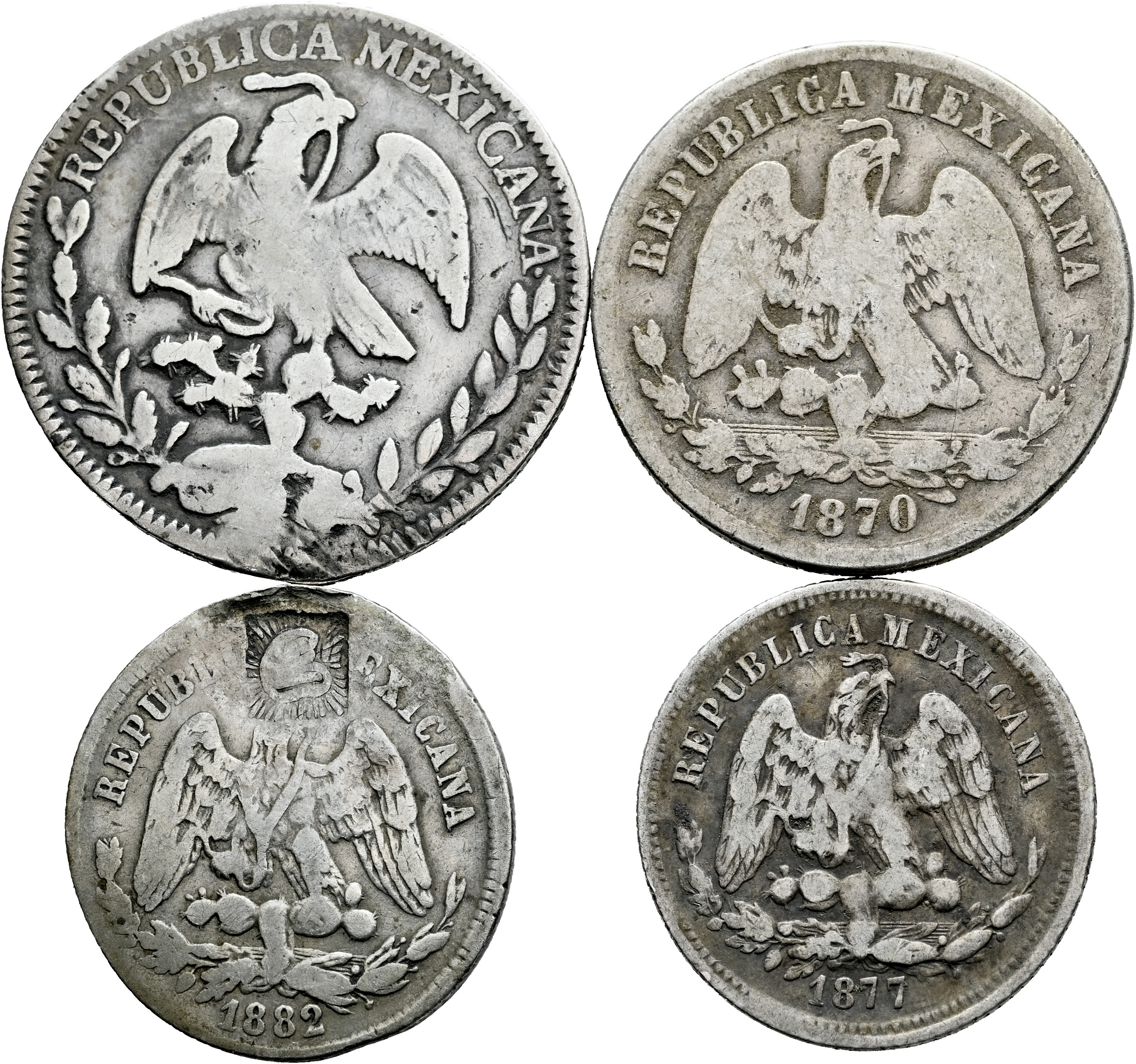 Lote de 4 monedas mexicanas de plata; 1 de 4 reales, 1 de 50 centavos y 2 de 25 centavos (una de ella con un curioso resello). Es imprescindible un riguroso examen. SOLO ENVÍO A ESPAÑA PENÍNSULA. NO SE ADMITE DEVOLUCIÓN. BC+. Est...70,00.