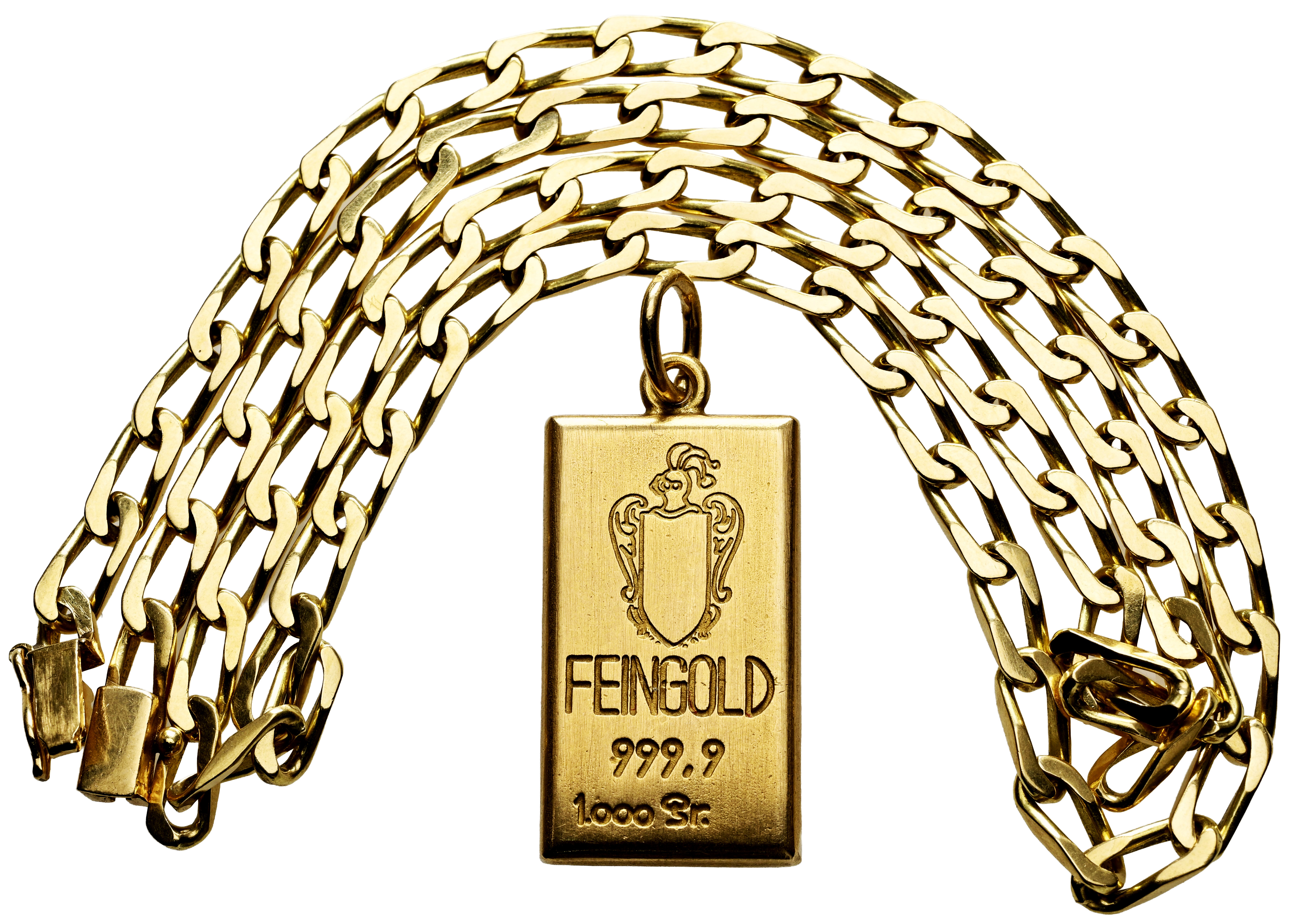 Lingote oro "FEINGOLD", con cadena de oro. El lingote tiene un peso de 19,09g. con 0.750 milésimas y la cadena tiene un peso de 26,60g. con 0.650 milésimas. Peso total: 47,69 g. Au. Est...3500,00.