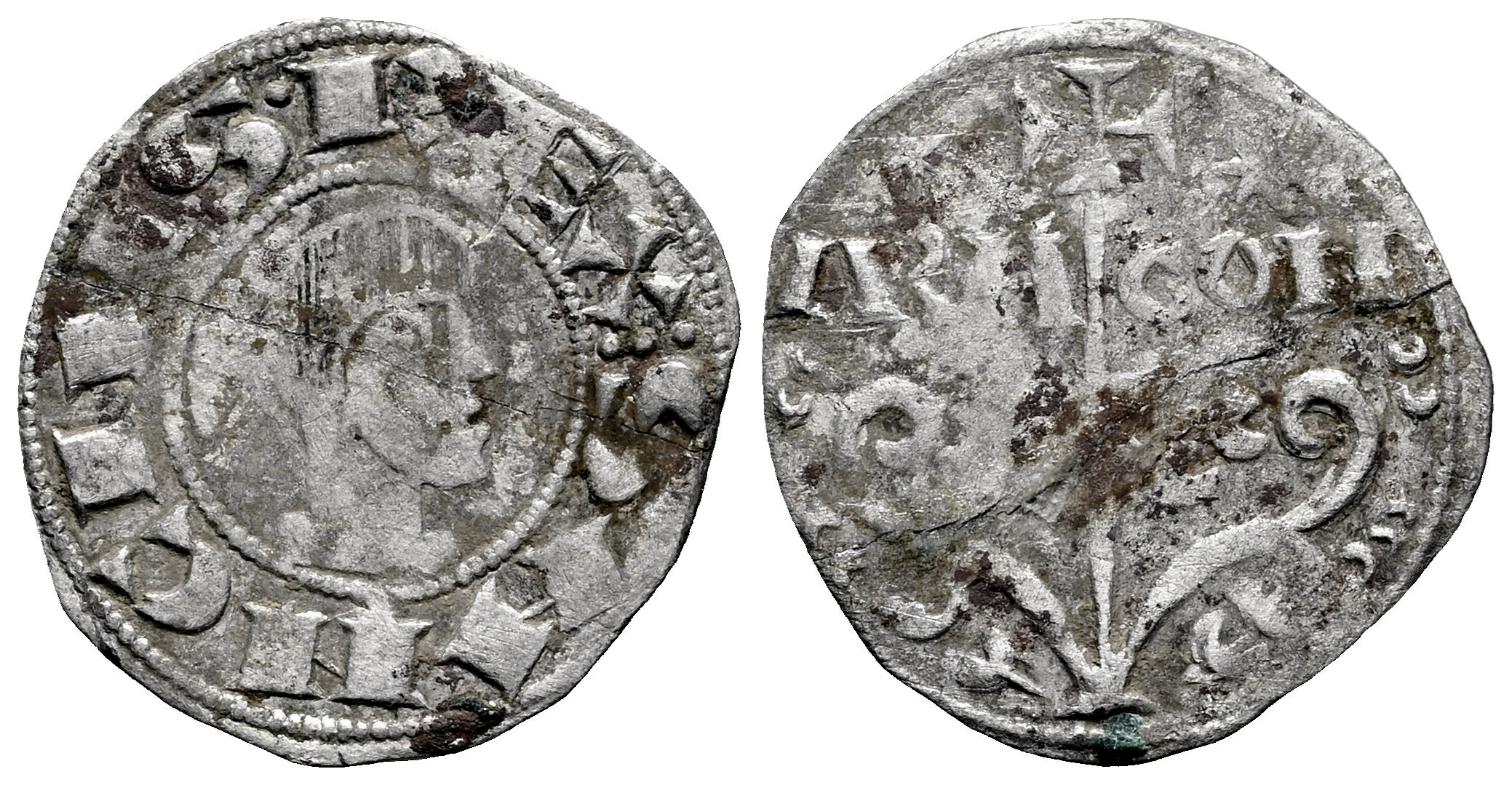 Reino de Navarra y Aragón. Sancho Ramírez (1063-1094). Dinero. Jaca (Huesca). (Ros-3.4.6/1). Anv.: ︙SANCIVS · REX. Cabeza a la derecha. Rev.: ARA - GON. Árbol superado por cruz, con dos ramas que parten desde la base. Ve. 0,82 g. Estrella a la derecha de la cruz. Doblez enderezado y reforzado con pegamento. Rara. BC+/MBC-. Est...100,00.