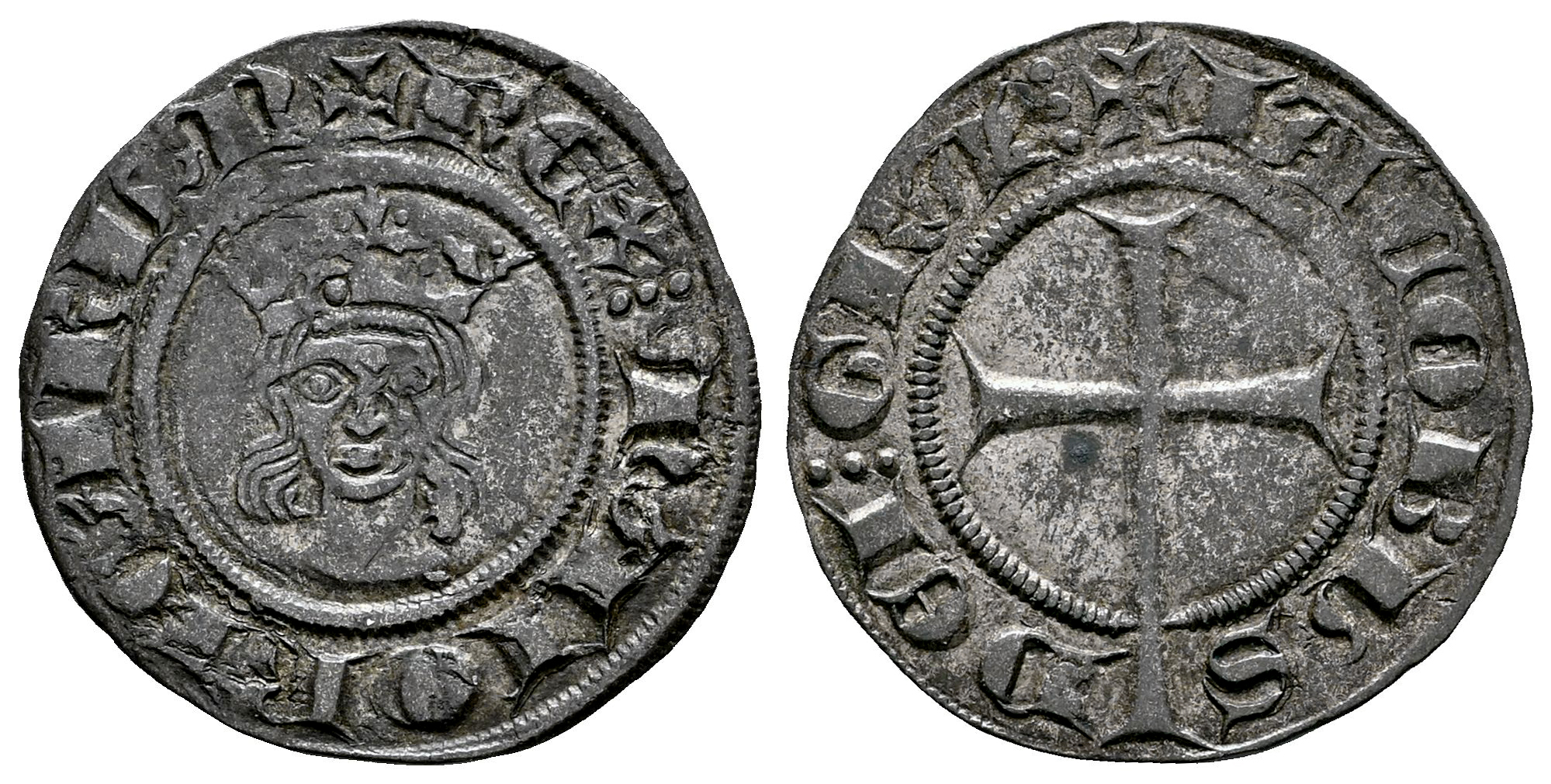 Corona de Aragón. Jaime II de Mallorca (1276-1285 y 1298-1311). Diner. Mallorca. (Cru V.S-542). Anv.: + REX ⁑ MAIORICARUM. Busto de frente. Rev.: + IACOBUS / DEI ⁑ GRA ⁑ . Cruz. Ve. 0,97 g. Pátina. Escasa. MBC+. Est...120,00.