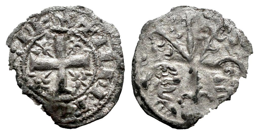 Reino de Castilla y León. Alfonso IX (1188-1230). Óbolo. (Bautista-252). Ve. 0,21 g. Con adornos de veros en los cantones de anverso. Punto y creciente a los lados de la cruz. Oxidaciones superficiales limpiadas. Cospel faltado. Rara. Ex Colección Hernández-Canut, Cayón (20/03/2020), lote 227. EBC-. Est...100,00.