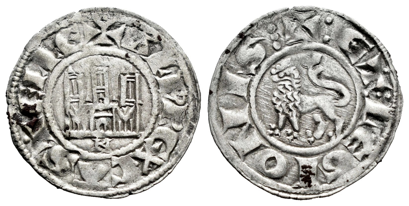Reino de Castilla y León. Alfonso X (1252-1284). Pepión. Murcia. (Bautista-347). Anv.: + ALF REX · CASTELLE. Rev.: + : ET︙LEGIONIS︙. Ve. 1,05 g. M bajo el castillo. Puntos sobre las letras T de la leyenda. Escasa. MBC+. Est...80,00.