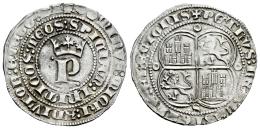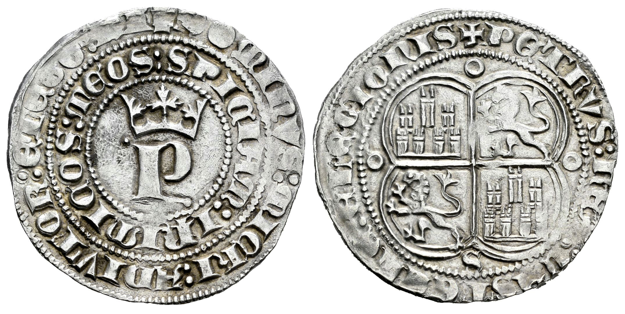 Reino de Castilla y León. Pedro I (1350-1368). 1 real. Sevilla. (Bautista-528 var.). Anv.: + DOMINVS : MIChI : ADIVTOR : ET EGO : DI / : SPICIAM : INIMICOS : MEOS. Rev.: + PETRVS : REX CASTELLE : E LEGIONIS. Ag. 3,53 g. S bajo el cuartelado. La N de INIMICOS está rectificada sobre otra letra. Escasa. MBC/MBC+. Est...250,00.