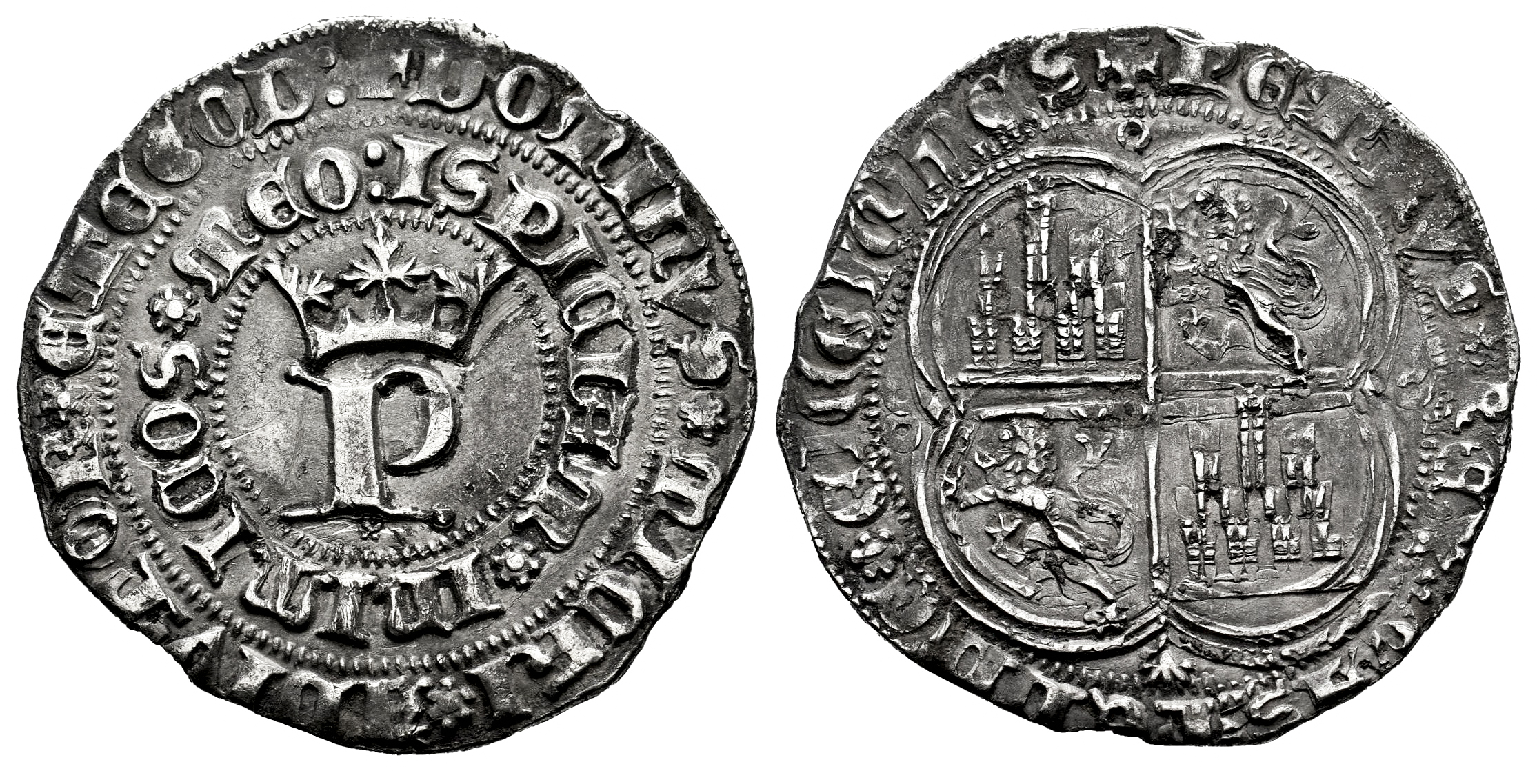 Reino de Castilla y León. Pedro I (1350-1368). 1 real. Coruña. (Bautista-529.6). Anv.: + DOMINVS ✿ MIChI ✿ ADIVTOR ✿ ET EGO D : / ISPICIAM ✿ INIMICOS ✿ MEO : . Rev.: + PETRVS ✿ REX ✿ CASTELLE ✿ E LEGIONES. Ag. 3,24 g. Aspa bajo la P coronada. Venera en el extremo inferior del eje vertical, roeles en los restantes. Roce en anverso. Rara. MBC+/MBC. Est...400,00.