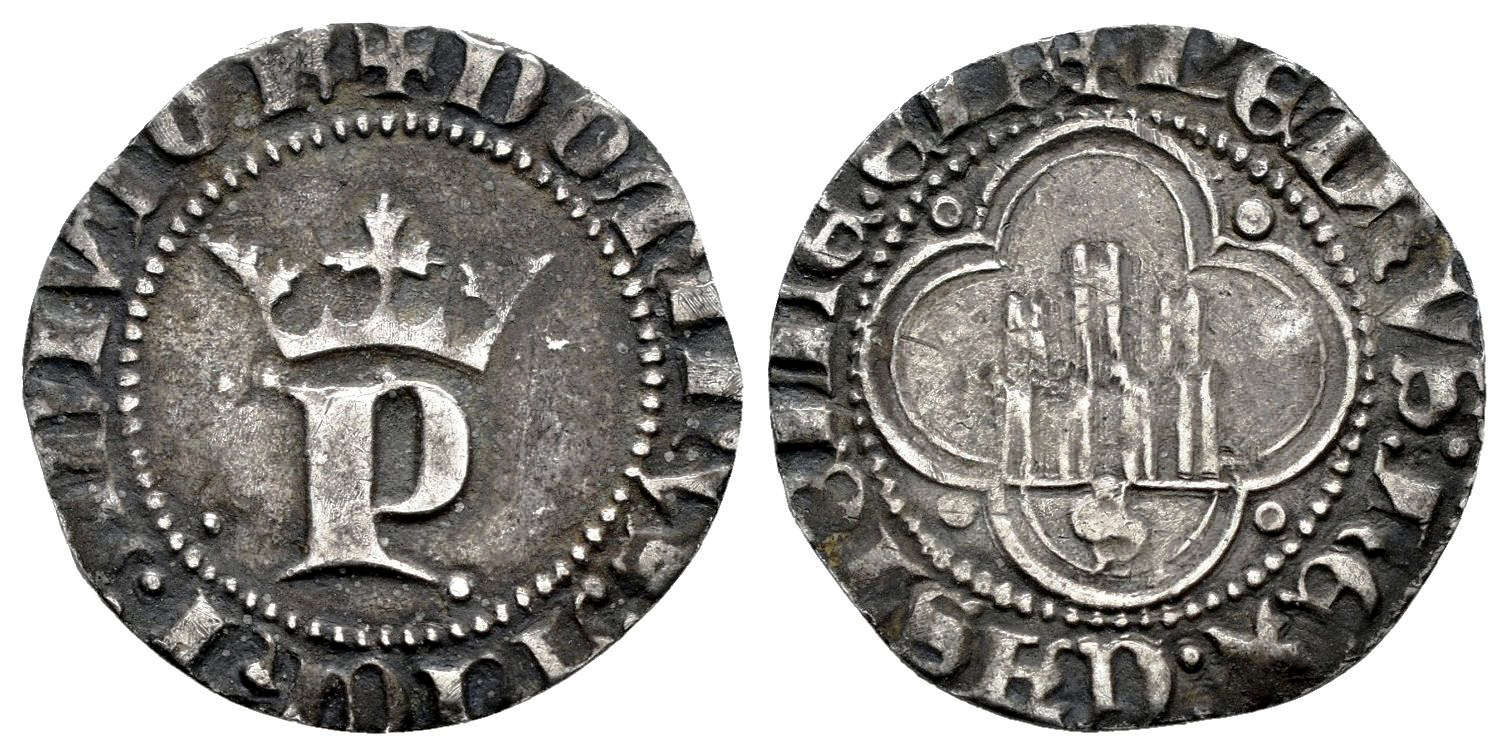 Reino de Castilla y León. Pedro I (1350-1368). 1/2 real. Sevilla. (Bautista-531 var.). Anv.: + DOMINVS : MIChI : ADIVTOR. Rev.: + PETRVS : REX : CASTELLE : E LE. Ag. 1,02 g. S bajo el castillo. Punto detrás de la P coronada. Pátina. Escasa. MBC+. Est...200,00.