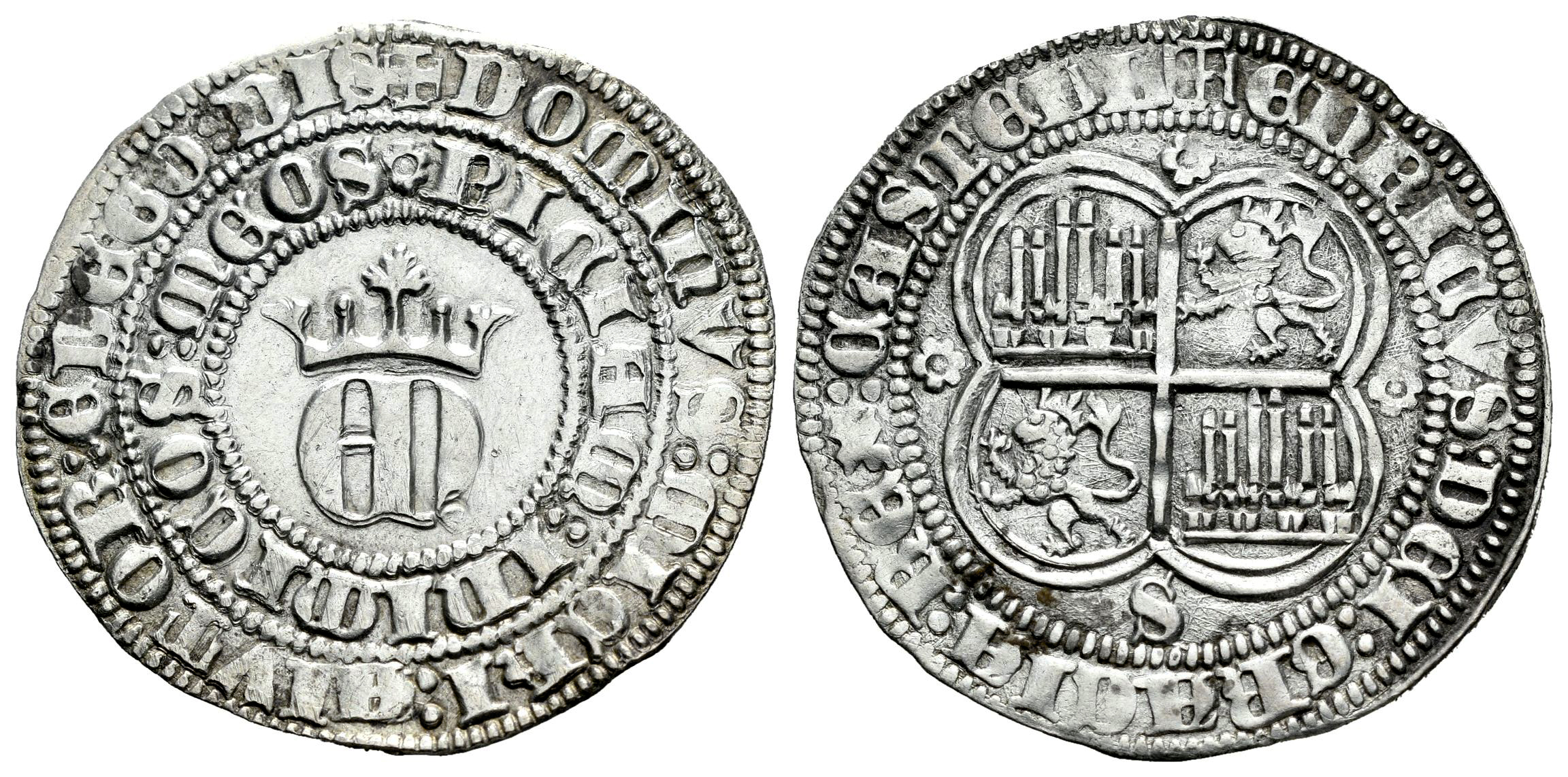 Reino de Castilla y León. Enrique II (1368-1379). 1 real. Sevilla. (Bautista-553 var.). Anv.: + DOMINVS : MIChI : AIVTOR : ED EGO : DIS / ✿ PICIAM : INIMICOS : MEOS. Rev.: + ENRICVS : DEI : GRACIA : REX : CASTELL. Ag. 3,47 g. S bajo el cuartelado. MBC+. Est...250,00.