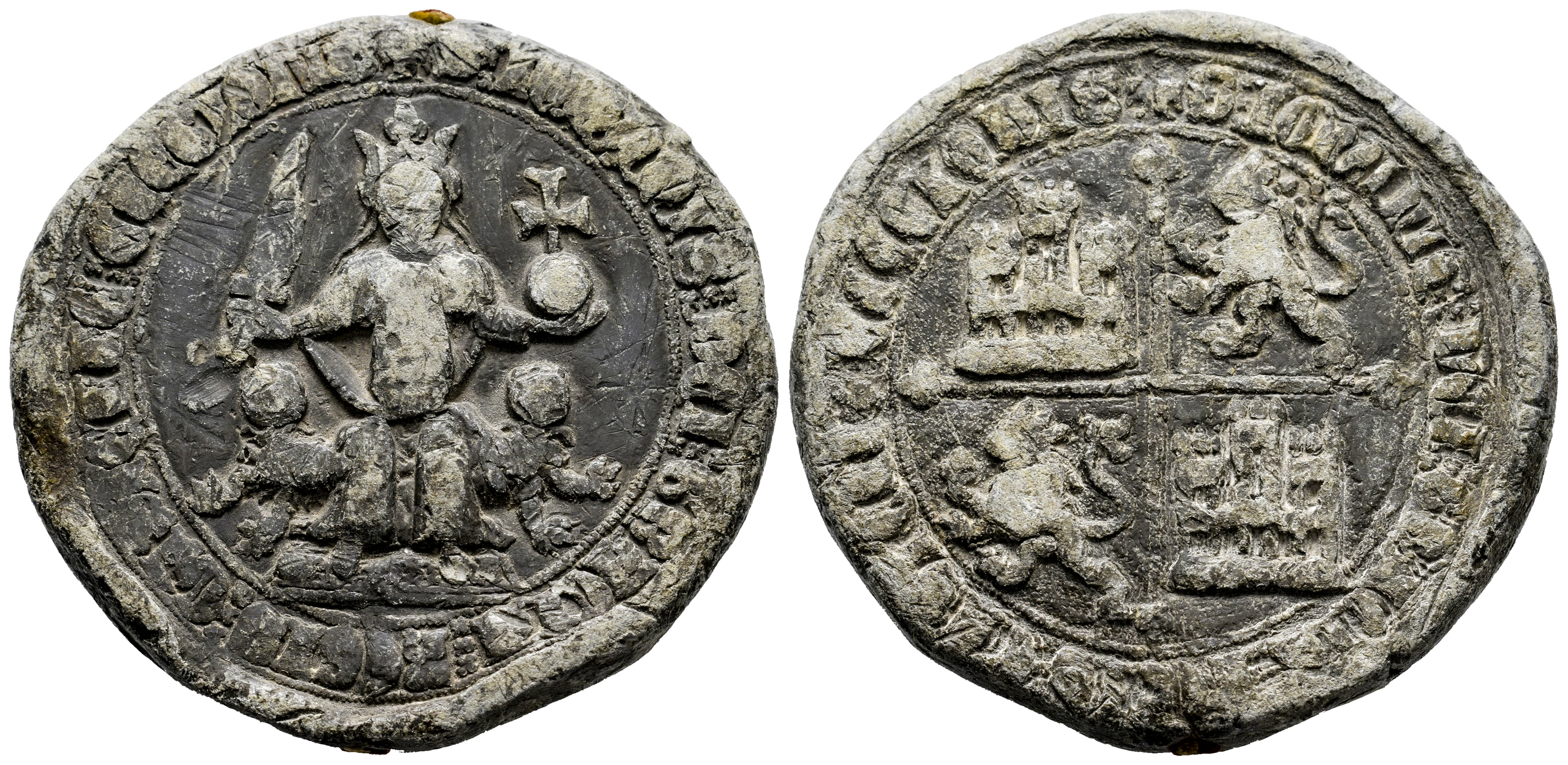 Reino de Castilla y León. Juan I (1379-1390). Sello de plomo. (Menéndez Pidal-45). (Guglieri-254). Anv.: + S ⋮ IhOANIS ⋮ DEI ⋮ GRACIA ⋮ REGIS ⋮ CASTELLE ⋮ E LEGIONIS. Rey coronado sentado en el trono con espada y globo crucífero en sus manos. Rev.: + S ⋮ IhOANIS ⋮ DEI ⋮ GRACIA ⋮ REGIS ⋮ CASTELL ⋮ E LEGIONIS. Cuartelado de Castilla y León separado por cruz flordelisada. Pb. 138,65 g. Raro. BC+. Est...350,00.