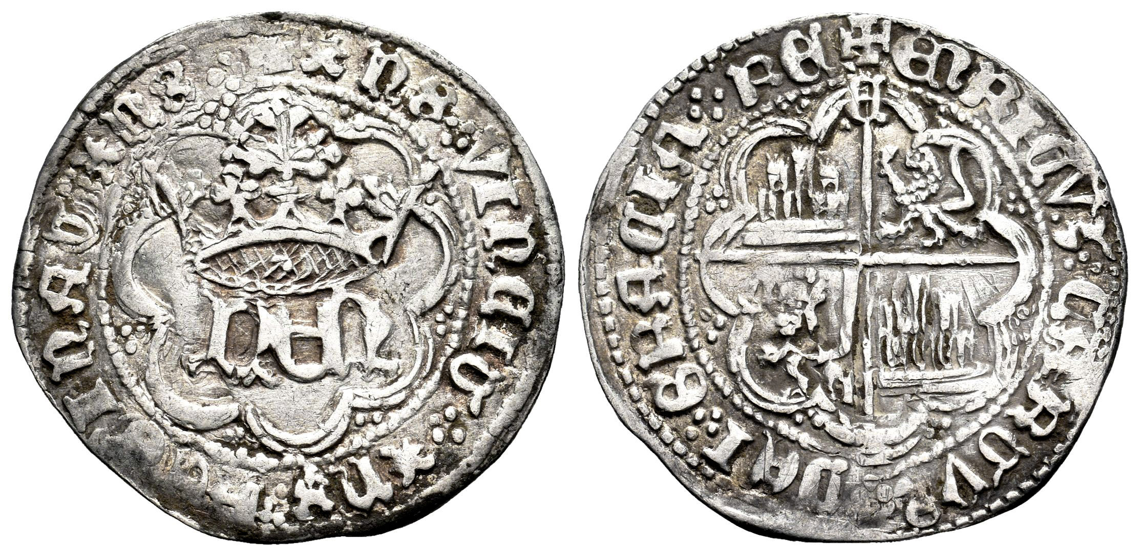Reino de Castilla y León. Enrique IV (1454-1474). 1 real. Cuenca. (Bautista-909 var.). Anv.: + XnS ·:· VINCIT ·:· XnS ·:· REGINAT ·:· XnS ·:·. Rev.: + ENRICVS ·:· CARTVS ·:· DEI ·:· GRACIA ·:· RE. Ag. 3,35 g. C y cuenco en los extremos del eje vertical. Leve doble acuñación. Escasa. MBC/MBC+. Est...300,00.