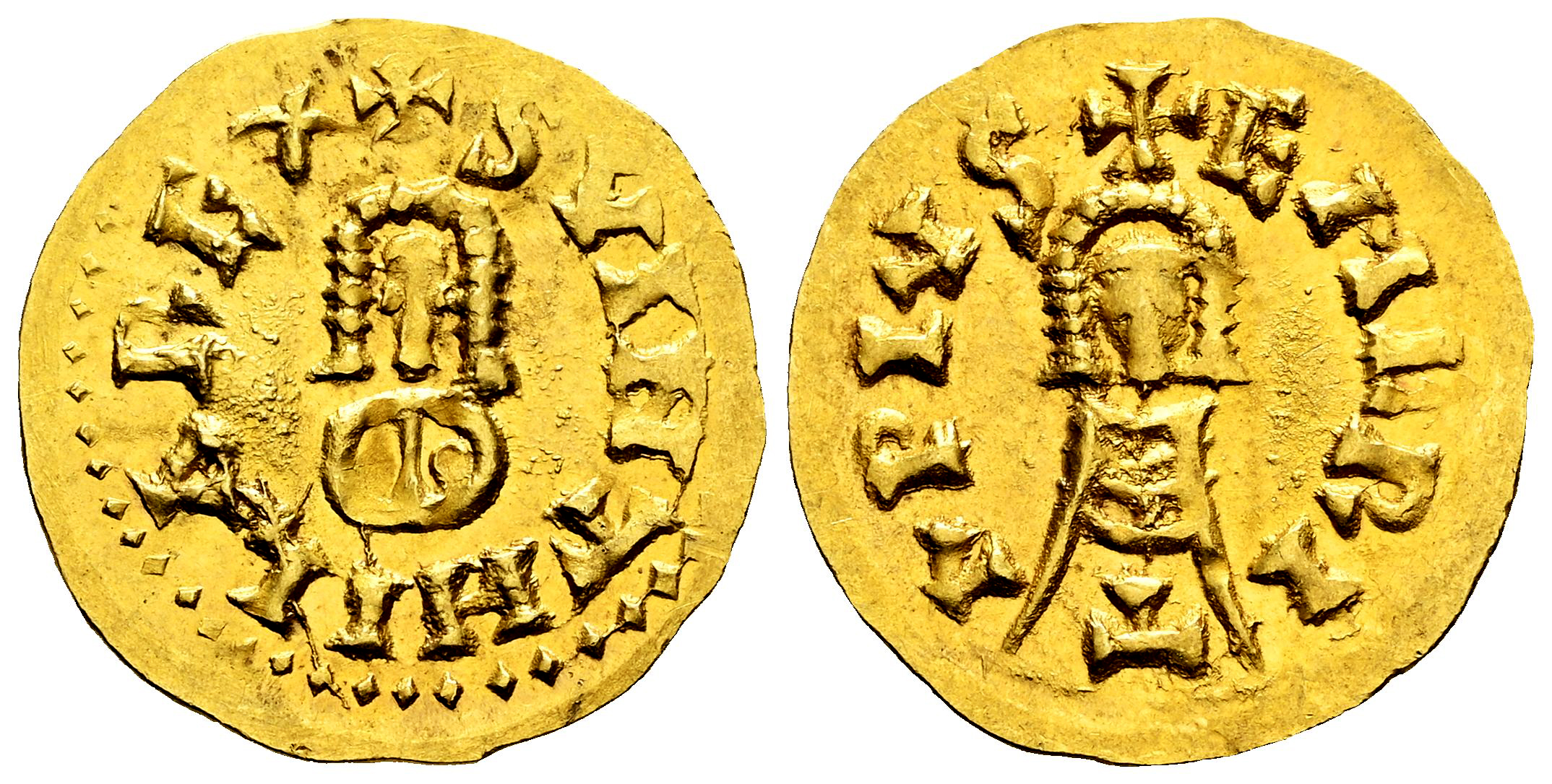 Suinthila (621-631). Tremissis. Emérita (Mérida). (Cnv-327). (R. Pliego-393a). Anv.: + SVINTHILAREX. Rev.: + EMERI|T|APIVS. Au. 1,50 g. Restos de brillo original. EBC-. Est...750,00.