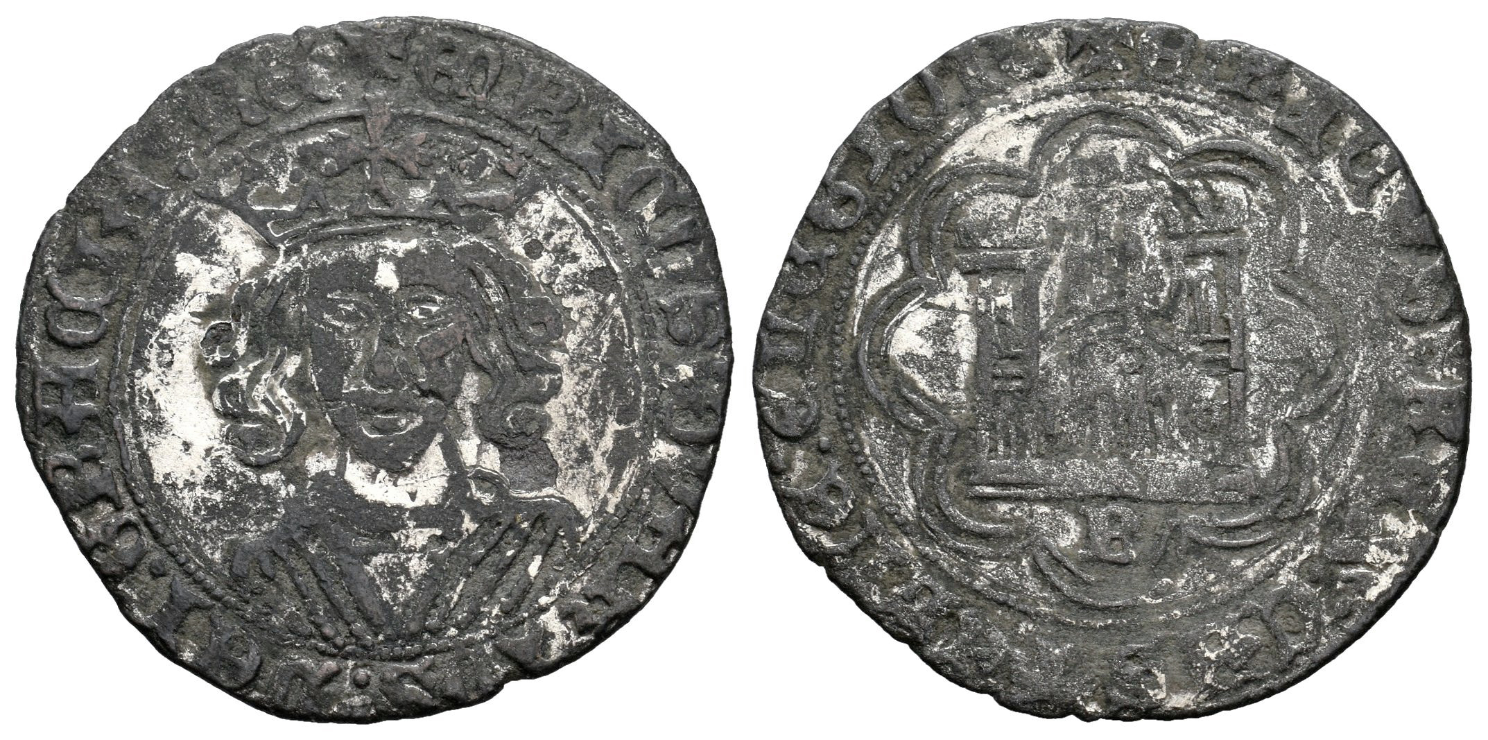 Reino de Castilla y León. Enrique IV (1454-1474). Cuartillo. Burgos. (Bautista-1000 var.). Anv.: + ENRICVS : QVARTVS : DEI : GRACIA : RE . Rev.: + ENRICVS : REX : CASTELLE : E LEGION. Ve. 2,42 g. B bajo castillo. Restos de plateado original. MBC-/BC+. Est...60,00.