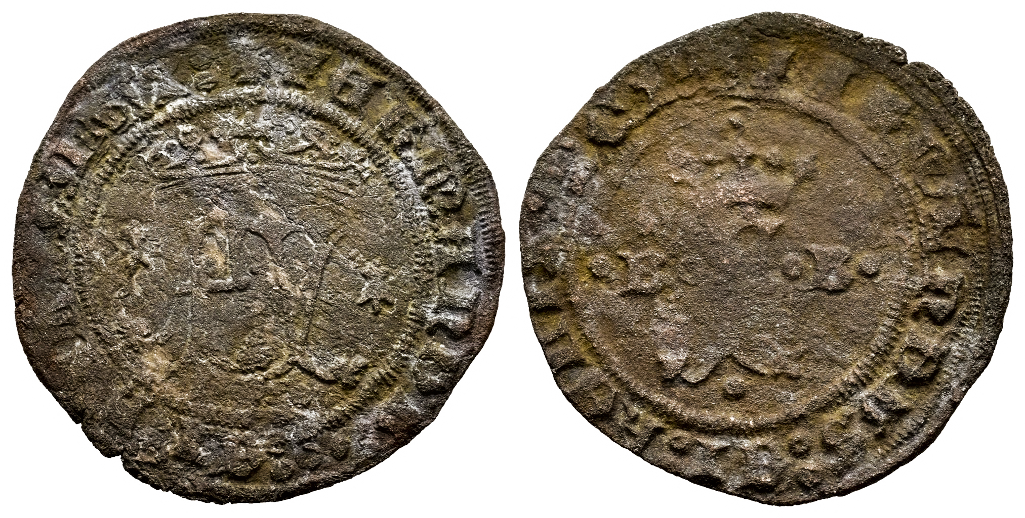 Fernando e Isabel (1474-1504). 2 maravedís. Burgos. Acuñada para circular por Santo Domingo. (Cal-69). Anv.: FY coronadas entre armiños. + FERNANDVS : ET : HELISABET : . Rev.: F coronada entre B-B acotadas por puntos. + FERNANDVS : ET : HELISABET : armiño. Ae. 3,17 g. Oxidaciones superficiales. Muy rara. BC+. Est...350,00.