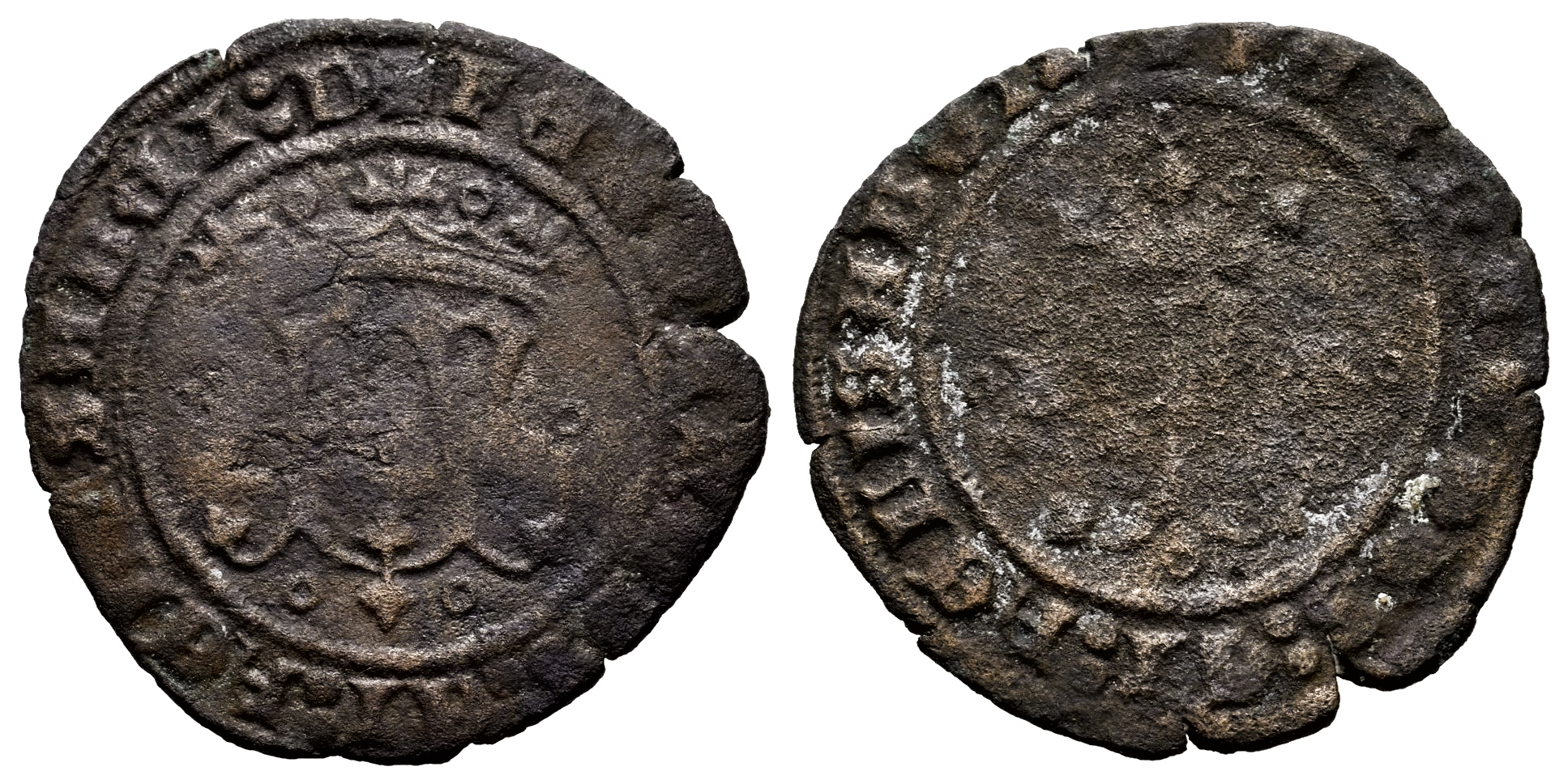Fernando e Isabel (1474-1504). 2 maravedís. Burgos. (Cal-Tipo 14). Ve. 2,36 g. Acuñada para circular por Santo Domingo. Rara. BC+/BC. Est...100,00.