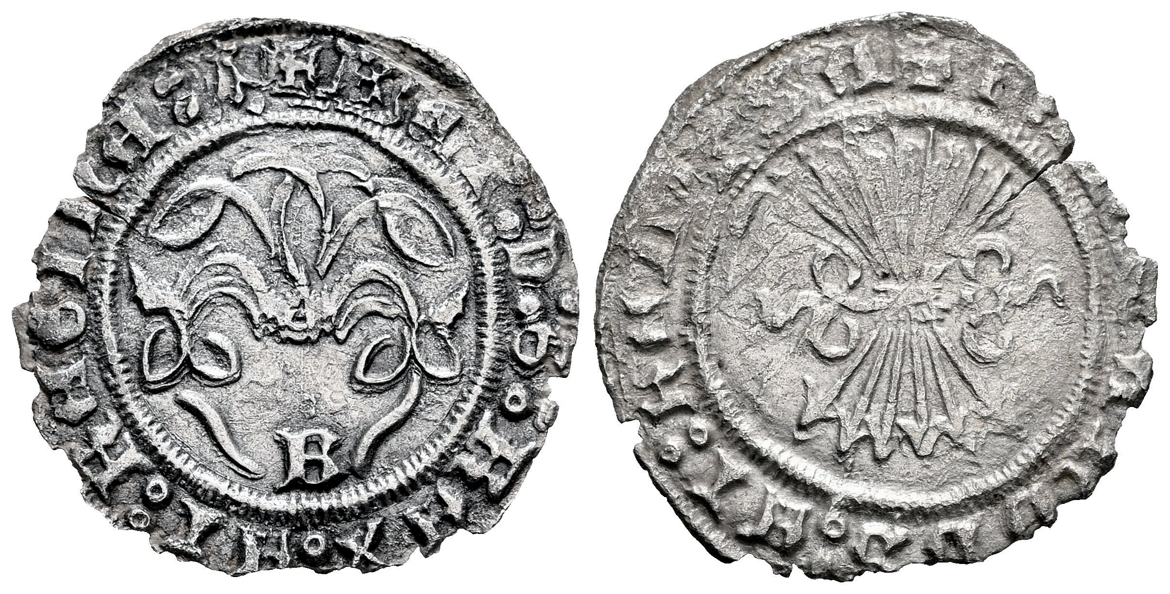 Fernando e Isabel (1474-1504). 1/2 real. Burgos. (Cal-187). Anv.: + BET : D : G : REX : ET : REGINA (Armiño). Rev.: + FERNANDVS : ET : hELISA. Ag. 1,42 g. Armiño al final de la leyenda de anverso. Cospel irregular. Ligeras oxidaciones. MBC. Est...70,00.
