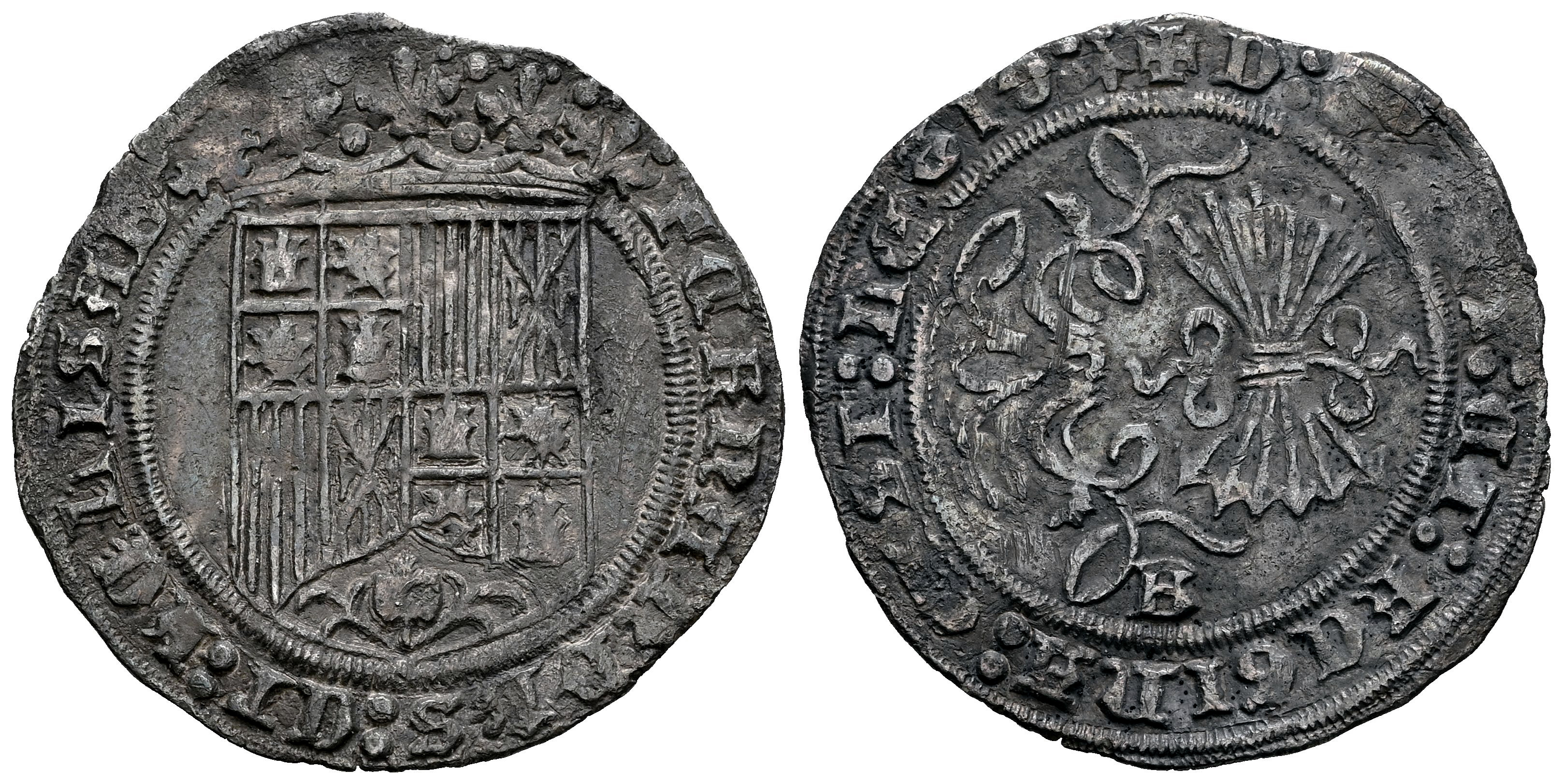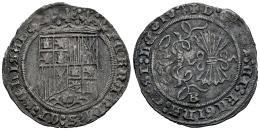 Fernando e Isabel (1474-1504). 1 real. Burgos. (Cal-305). Ag. 3,05 g. Armiño al final de la leyenda, en reverso. Pátina oscura. MBC. Est...100,00.