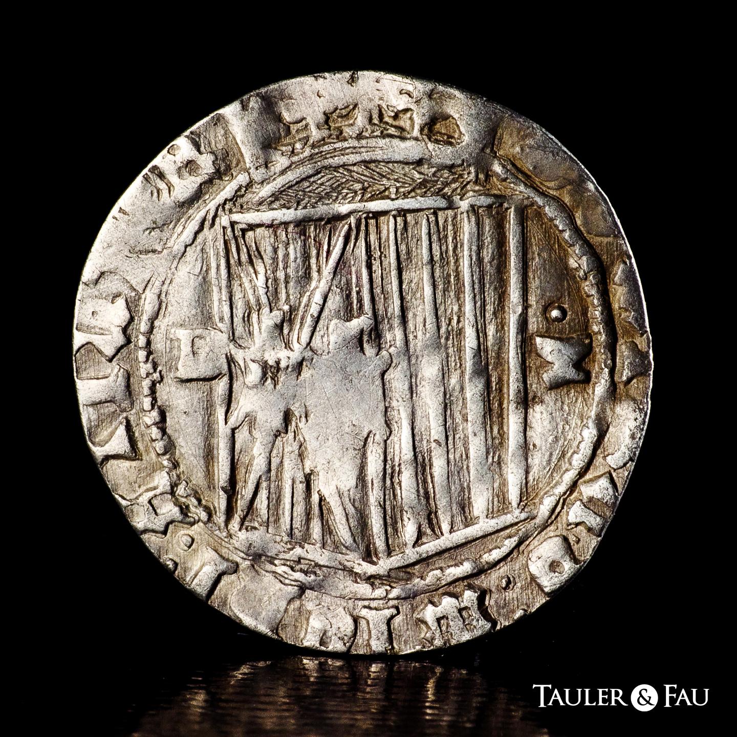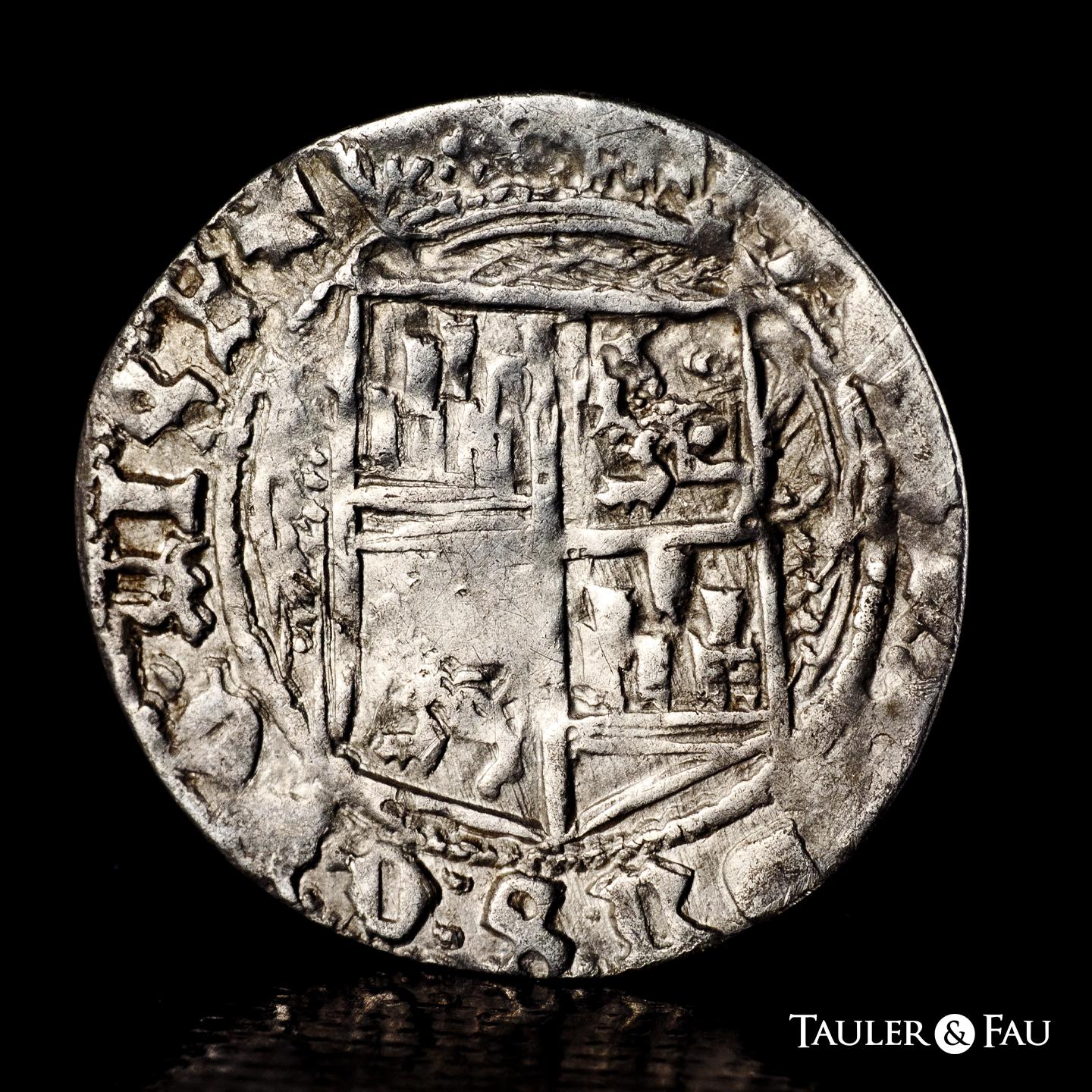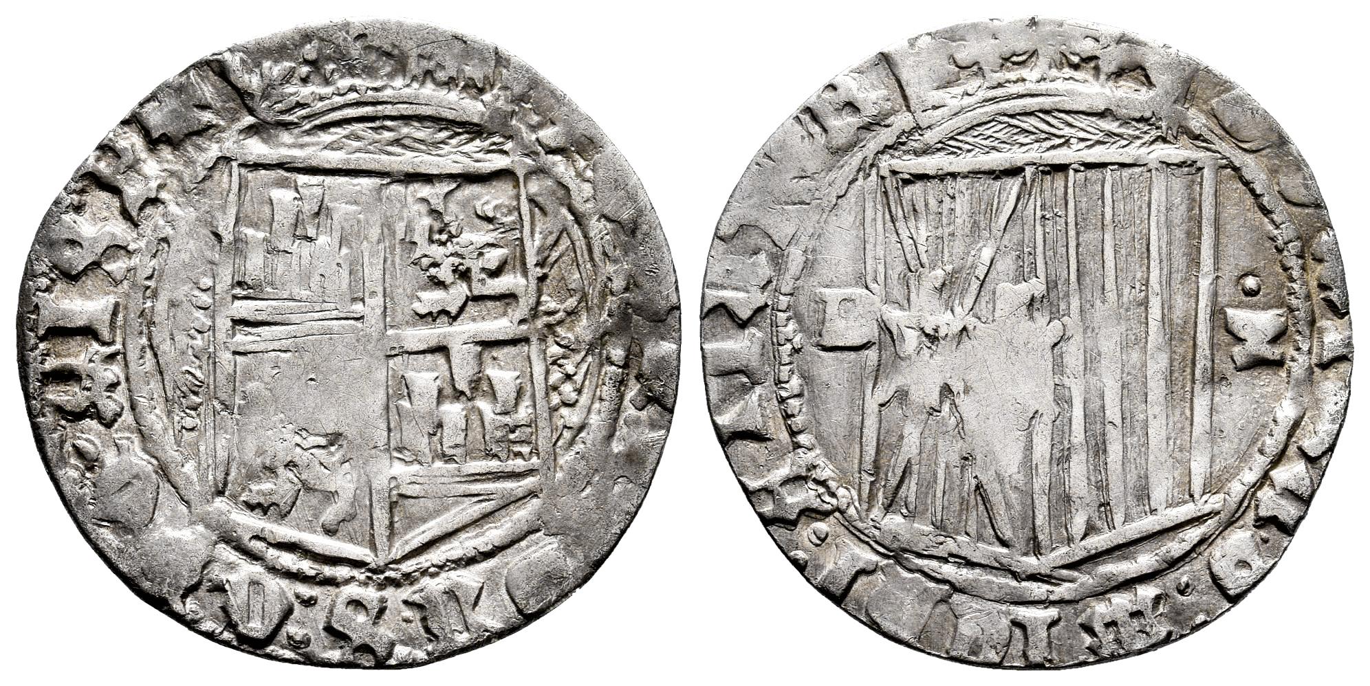 Fernando e Isabel (1474-1504). 1 real. Cuenca. (Cal-336). (Bautista-1040, mismo ejemplar). Ag. 2,92 g. Anterior a la Pragmática. Escudo entre C gótica invertida y cuenco superado de punto en reverso. Cuarteles Aragón y Sicilia intercambiados en reverso. Muy rara. MBC. Est...750,00.