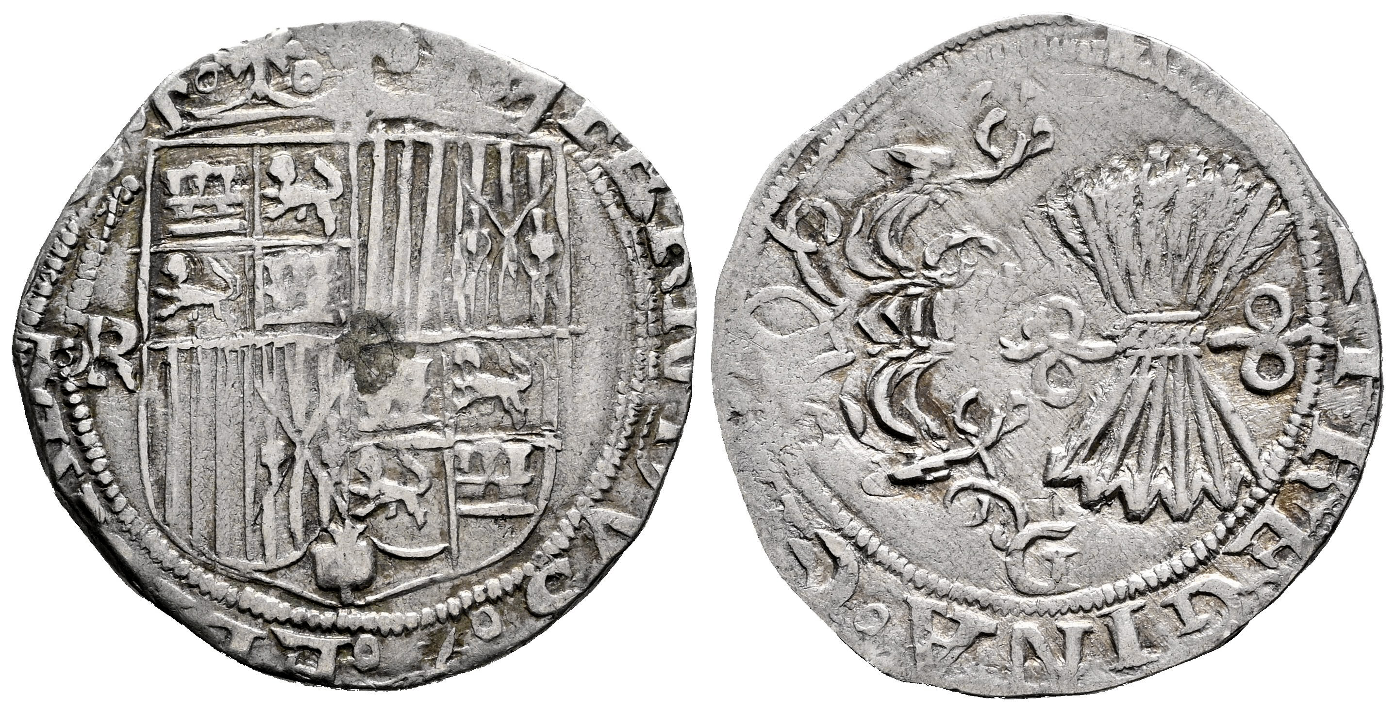Fernando e Isabel (1474-1504). 1 real. Granada. R. (Cal-375). Ag. 3,37 g. Ensayador R en anverso, marca de ceca G en reverso. MBC-. Est...60,00.