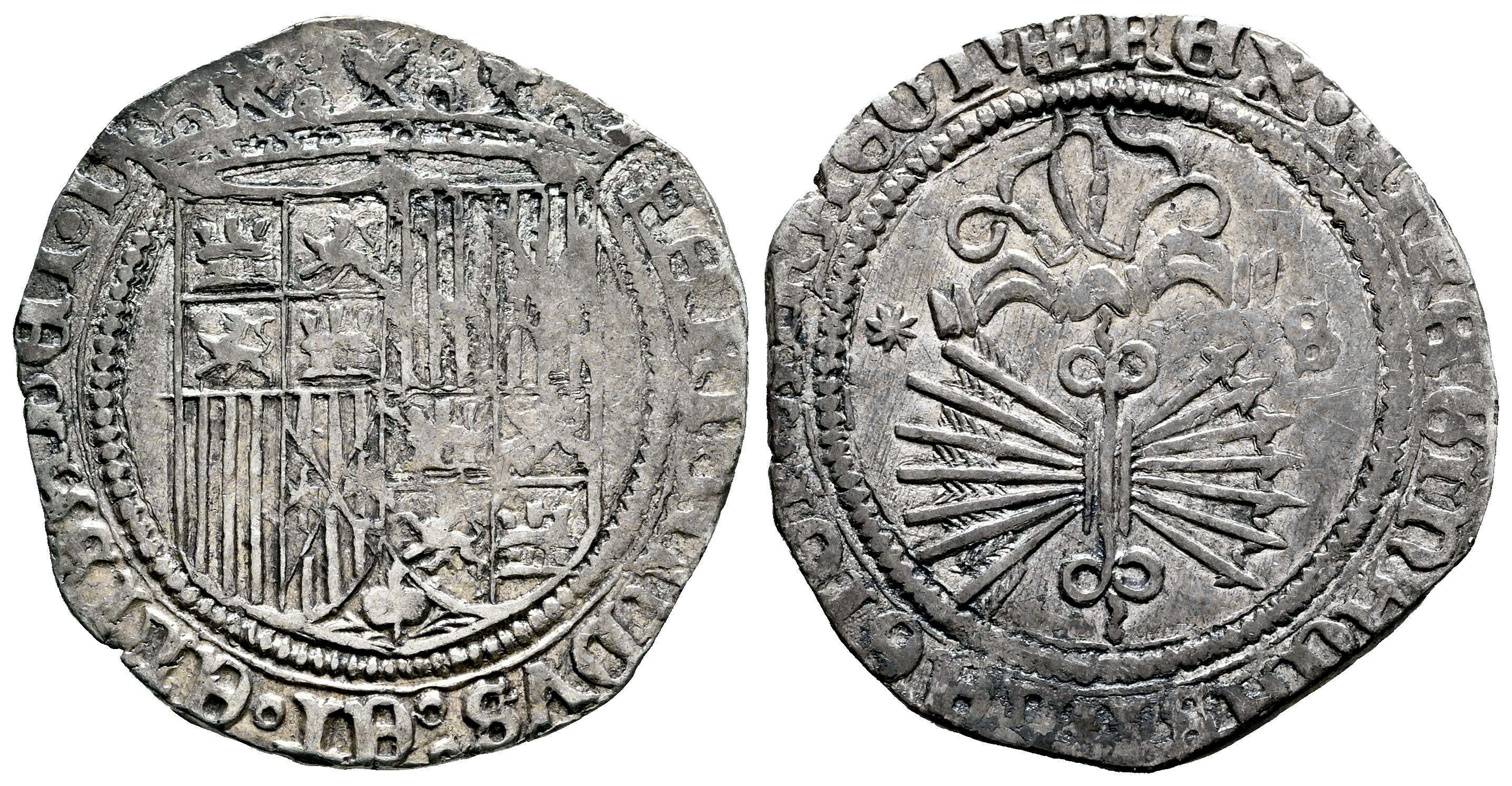 Fernando e Isabel (1474-1504). 1 real. Sevilla. (Cal-415). Anv.:  FERNANDVS : ET : ELISABET : D. Rev.: + REX : ET REGINA CAST : LEGIONIS : ARAGON. Ag. 3,39 g.  Estrella y S en reverso. MBC/MBC+. Est...100,00.