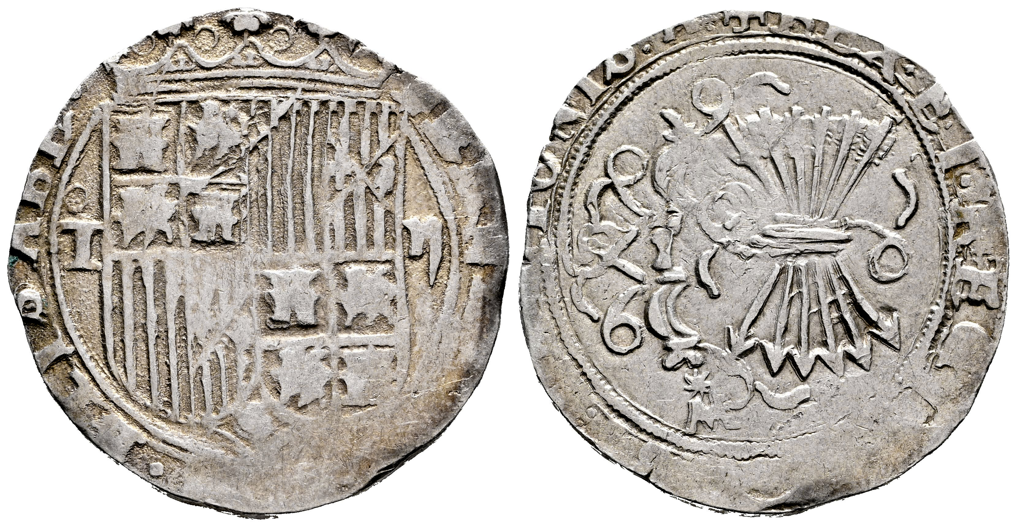Fernando e Isabel (1474-1504). 2 reales. Toledo. M. (Cal-531). Ag. 6,81 g. M superada de estrella en reverso. MBC-. Est...150,00.