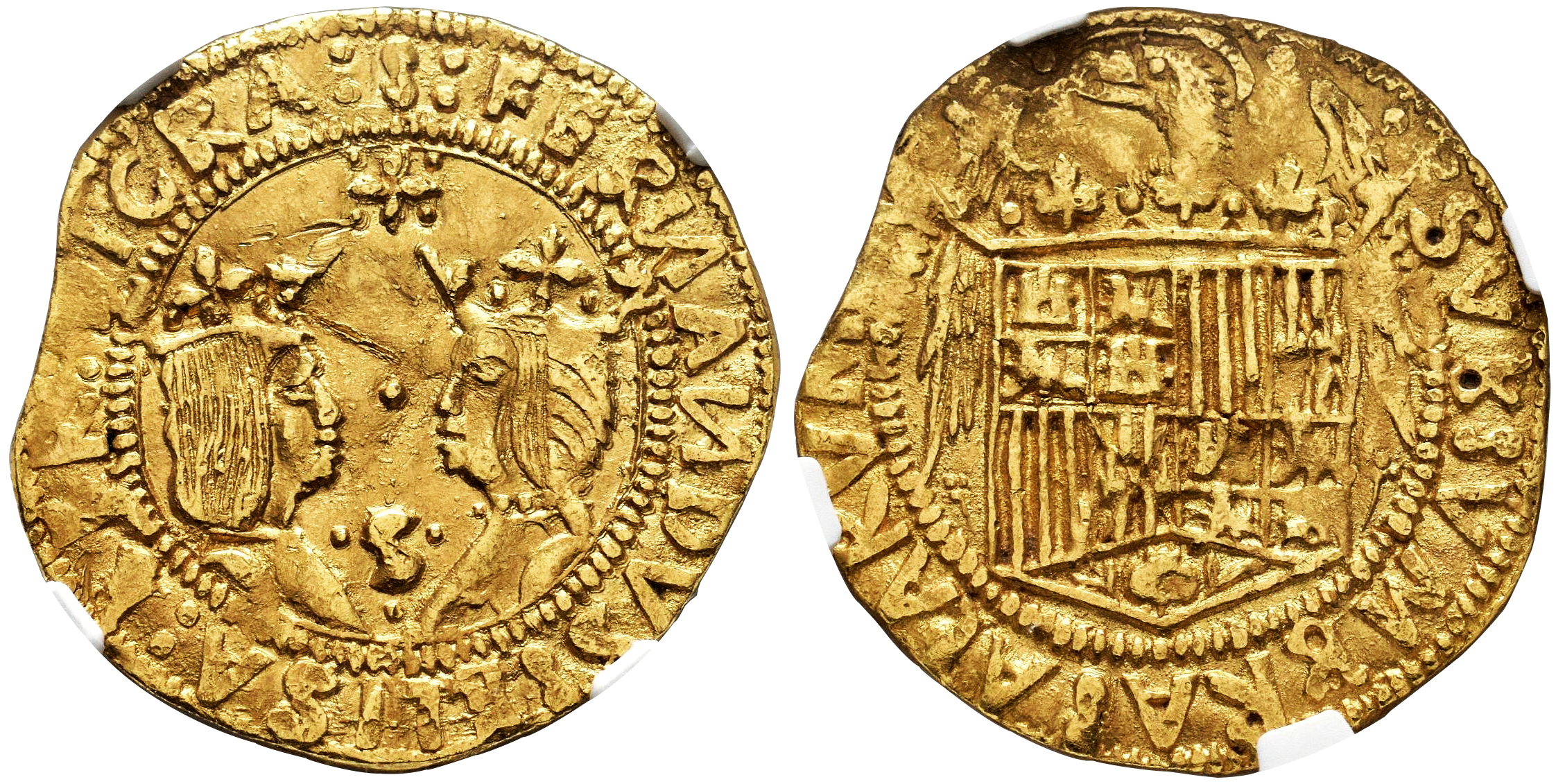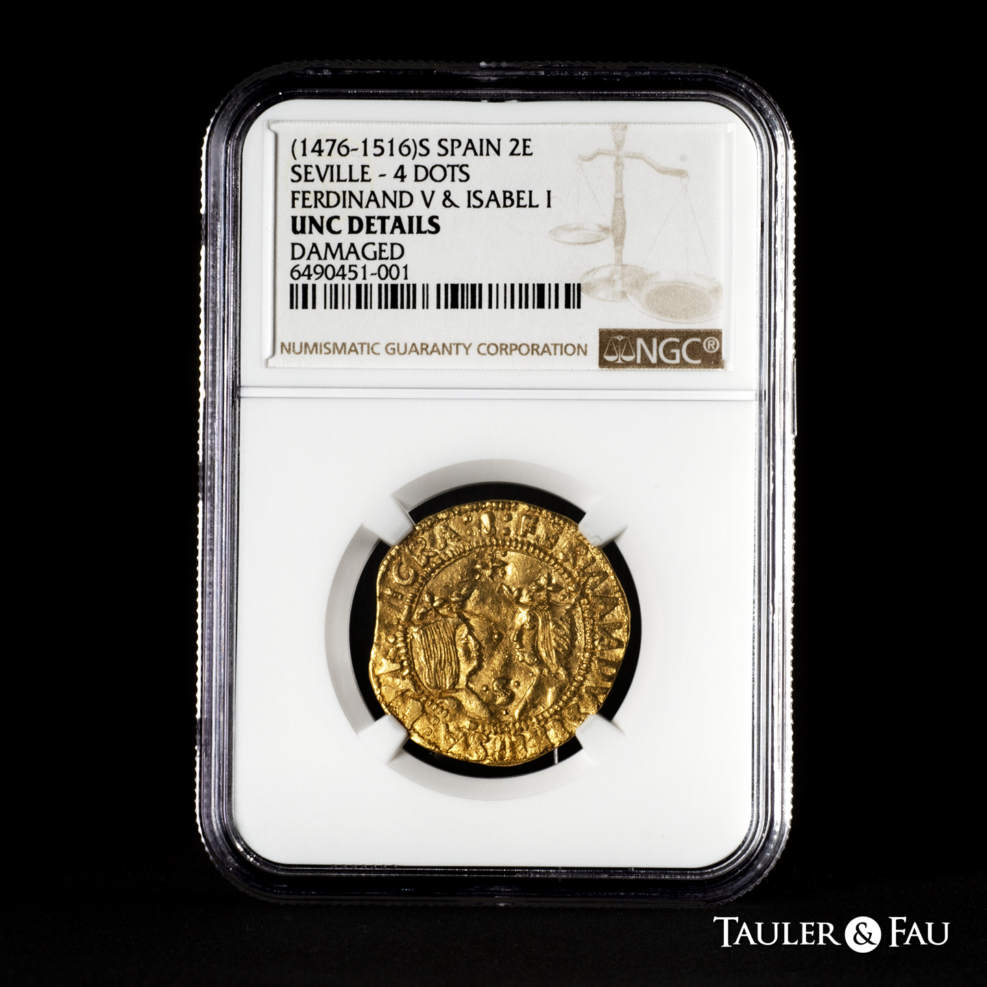 Fernando e Isabel (1474-1504). Doble excelente. Sevilla. (Cal-733). Anv.: s : FERИAИDVS : ELISA : BER : DIGRA :. Bustos de los monarcas enfrentados, con un punto entre ellos. En la parte superior, una cruz con puntos en los cuartos interiores y, debajo, una S delimitada por puntos a ambos lados y bajo ella. Rev.: SVB s VMBRA s ALARVM (s IA). Au. Cospel irregular. Encapsulada por NGC como AU Details, damaged. Est...2200,00.