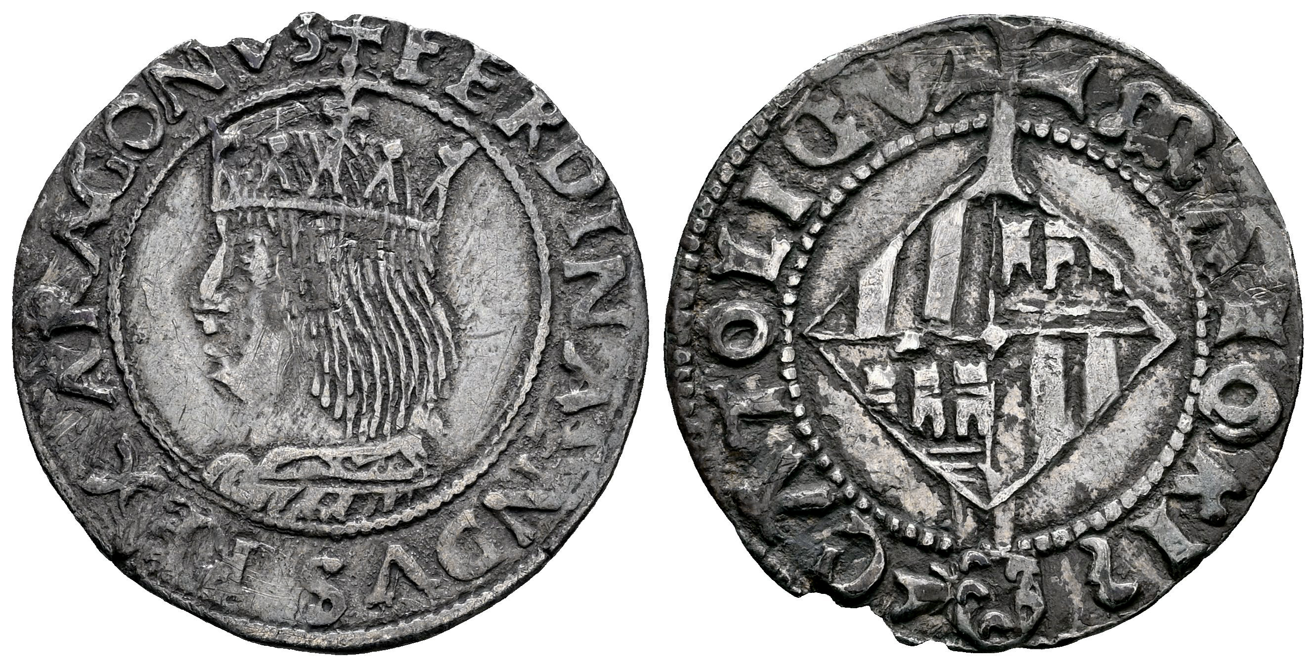 Fernando II (1479-1516). 1 real. ND (1508-1516). Mallorca. (Cal-64). Ag. 2,22 g. Corona de 5 florones. Marca: escudito con crecientes. Cospel ligeramente faltado. Pátina. Escasa. MBC+. Est...250,00.