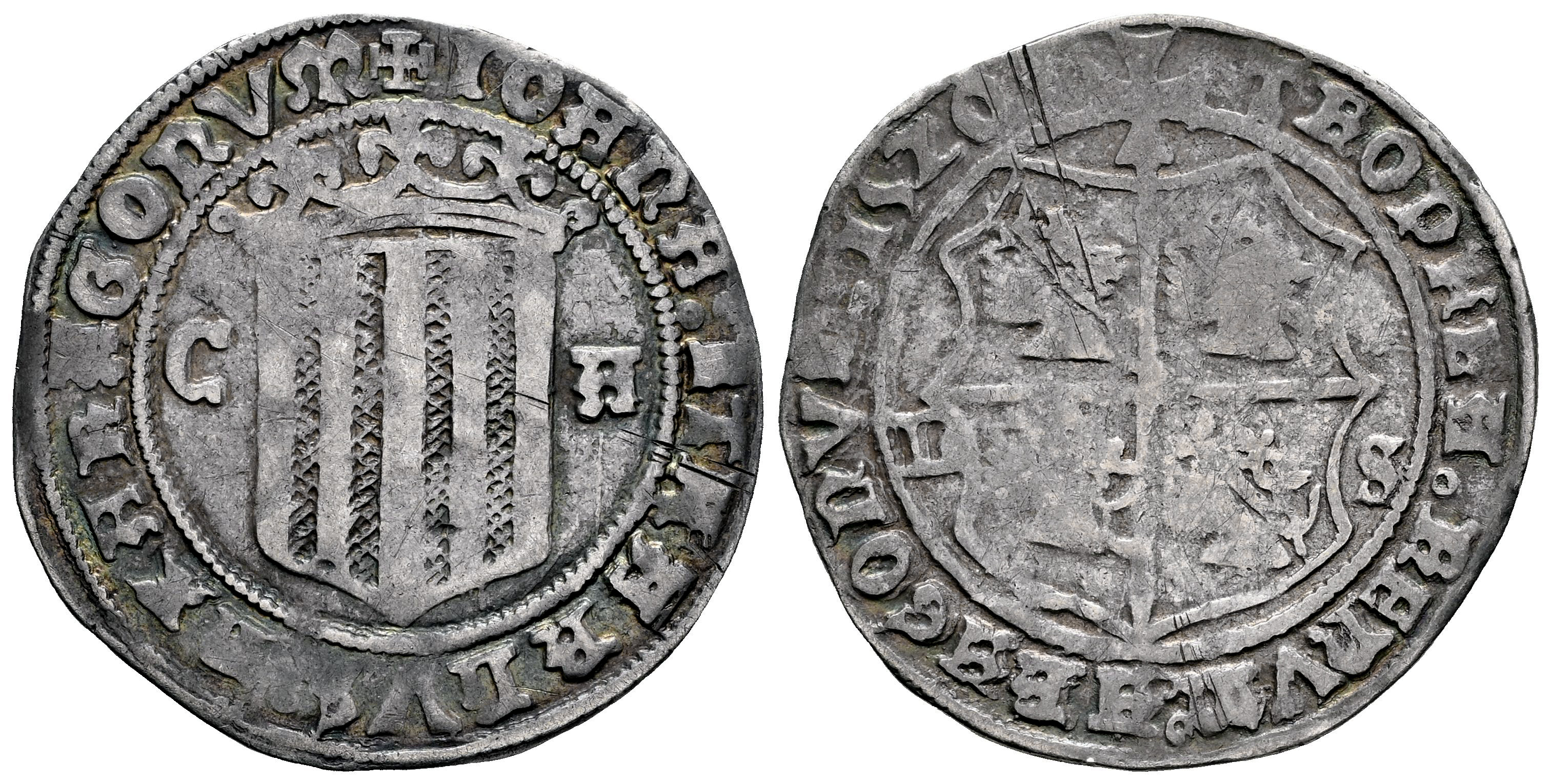 Juana y Carlos (1504-1555). 1 real. 1520. Zaragoza. LS. (Cal-83). Ag. 3,34 g. Leyendas completas. Ligera pátina. Escasa. MBC. Est...300,00.
