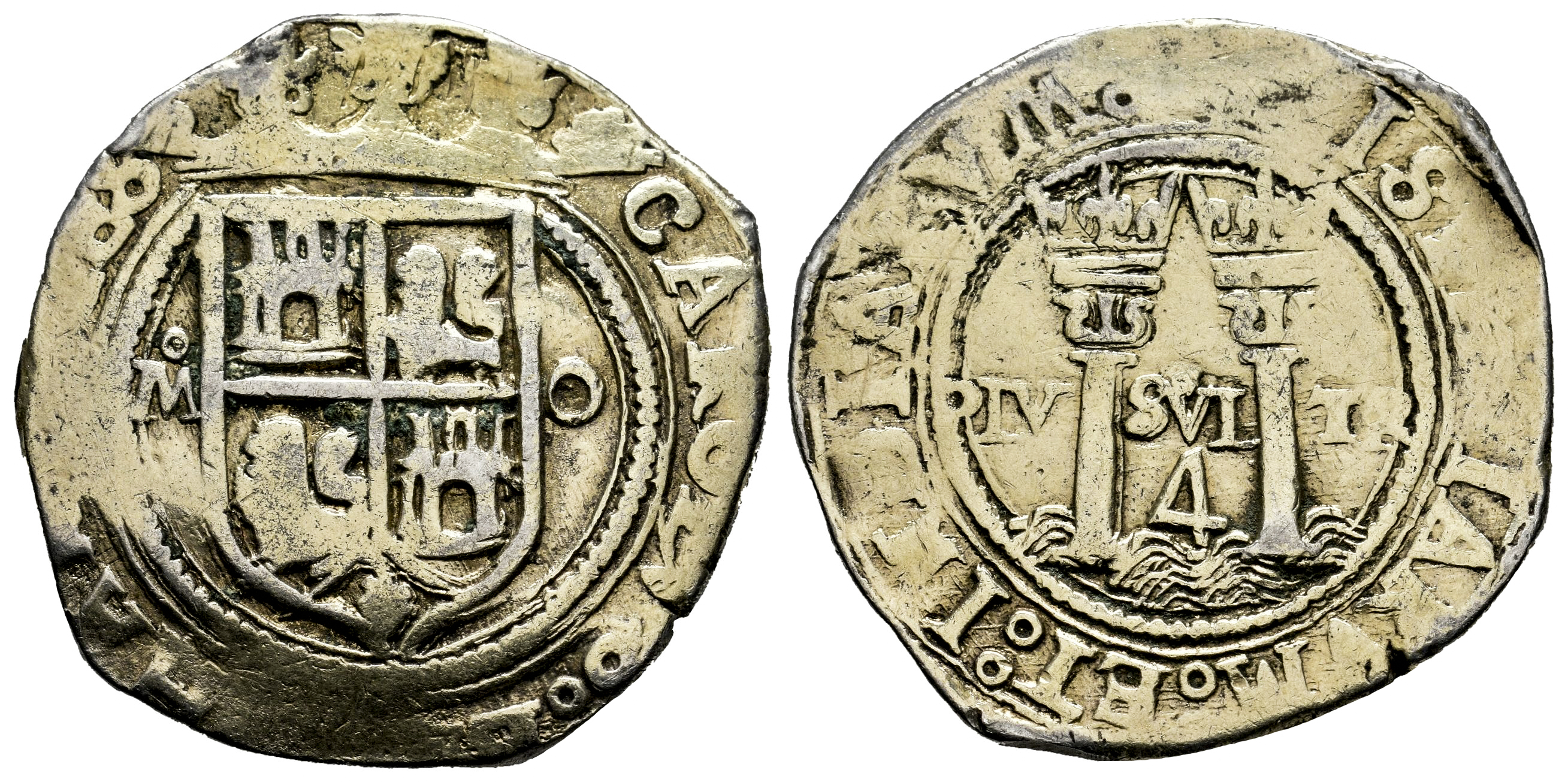 Juana y Carlos (1504-1555). 4 reales. ND (1554-1556). México. O. (Cal-138). Ag. 13,50 g. Escudo entre M - O. Ligeramente sobredorada. Sirvió como joya. MBC-/MBC. Est...300,00.