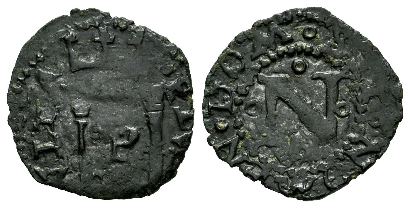 Carlos I (1516-1556). Cornado. Pamplona. (Cal-43). (Ros-4.2.9 var.). Anv.: Columnas de Hércules sobre el mar coronadas, entre ellas P acotada por puntos verticalmente. · PLVS - VLTA. Rev.: N entre cuatro roeles. SIT ◦ NOMEN ◦ DOM ◦. Ae. 0,75 g. Variante con error en la leyenda VLTA en lugar de VLTR. Muy rara. MBC-. Est...50,00.