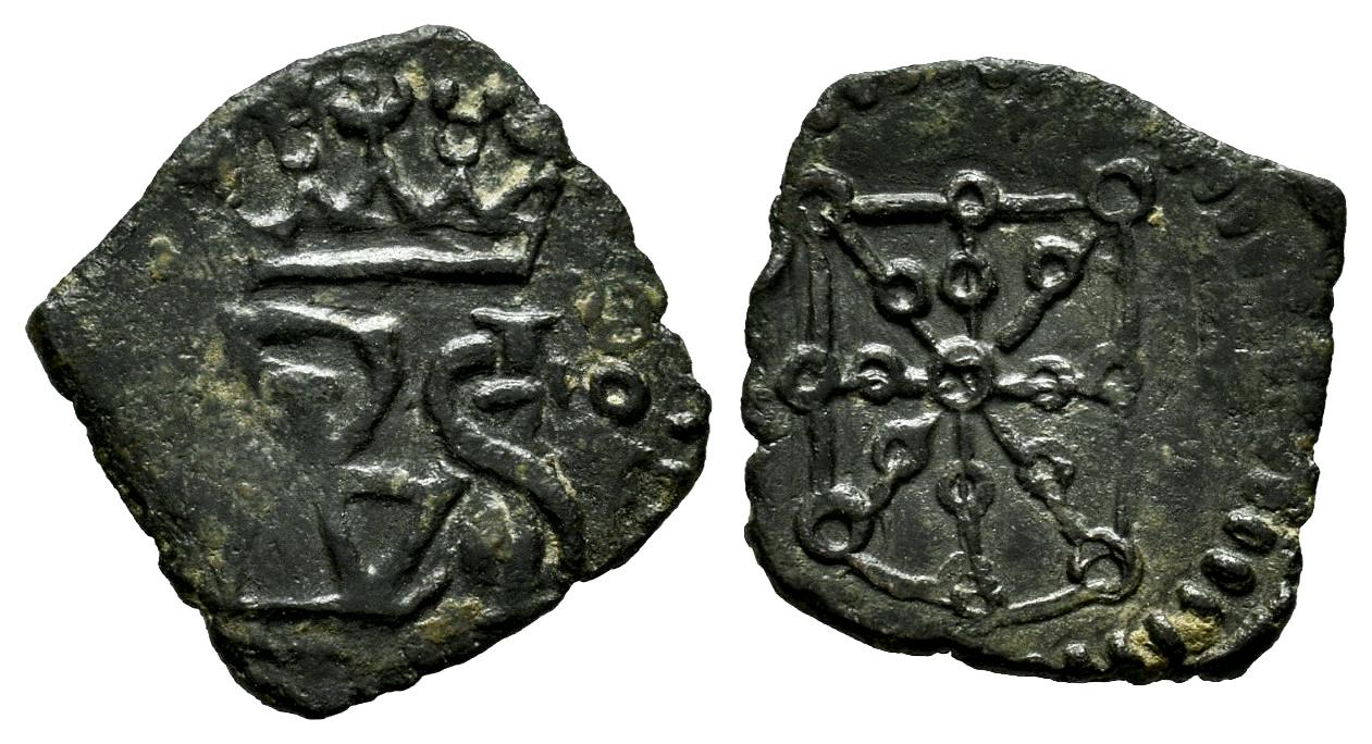 Felipe II (1556-1598). Cornado. Pamplona. (Cal-21). (Ros-4.3.4 var.). Anv.: Monograma coronado acotado por roeles. Rev.: Escudo de Navarra sin corona y sin acotar por puntos o roeles. Ae. 0,81 g. Buen ejemplar. Rara así. MBC+/EBC-. Est...80,00.