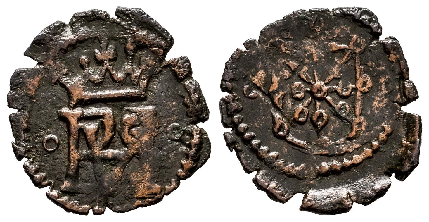 Felipe II (1556-1598). Cornado. Pamplona. (Cal-21 var). (Ros-4.3.4). Anv.: Monograma coronado entre roeles. Rev.: Escudo de Navarra sin corona y acotado por tres roeles, uno a cada lado y otro sobre el escudo. Ae. 0,90 g.  Flan grande. Muy rara. MBC+. Est...60,00.