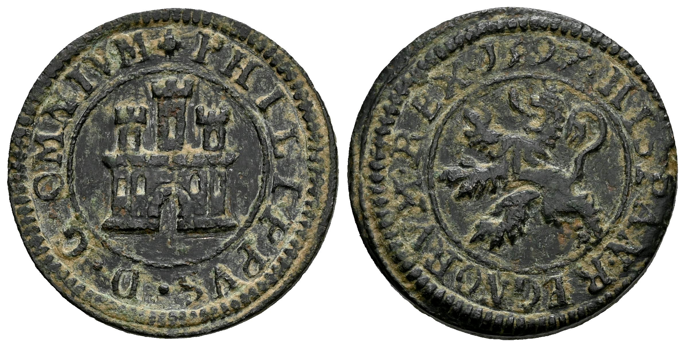Felipe II (1556-1598). 2 maravedís. 1597. Segovia. (Cal-86). (Jarabo-Sanahuja-B13). Ae. 3,65 g. Sin indicación de ceca ni valor. MBC+. Est...60,00.