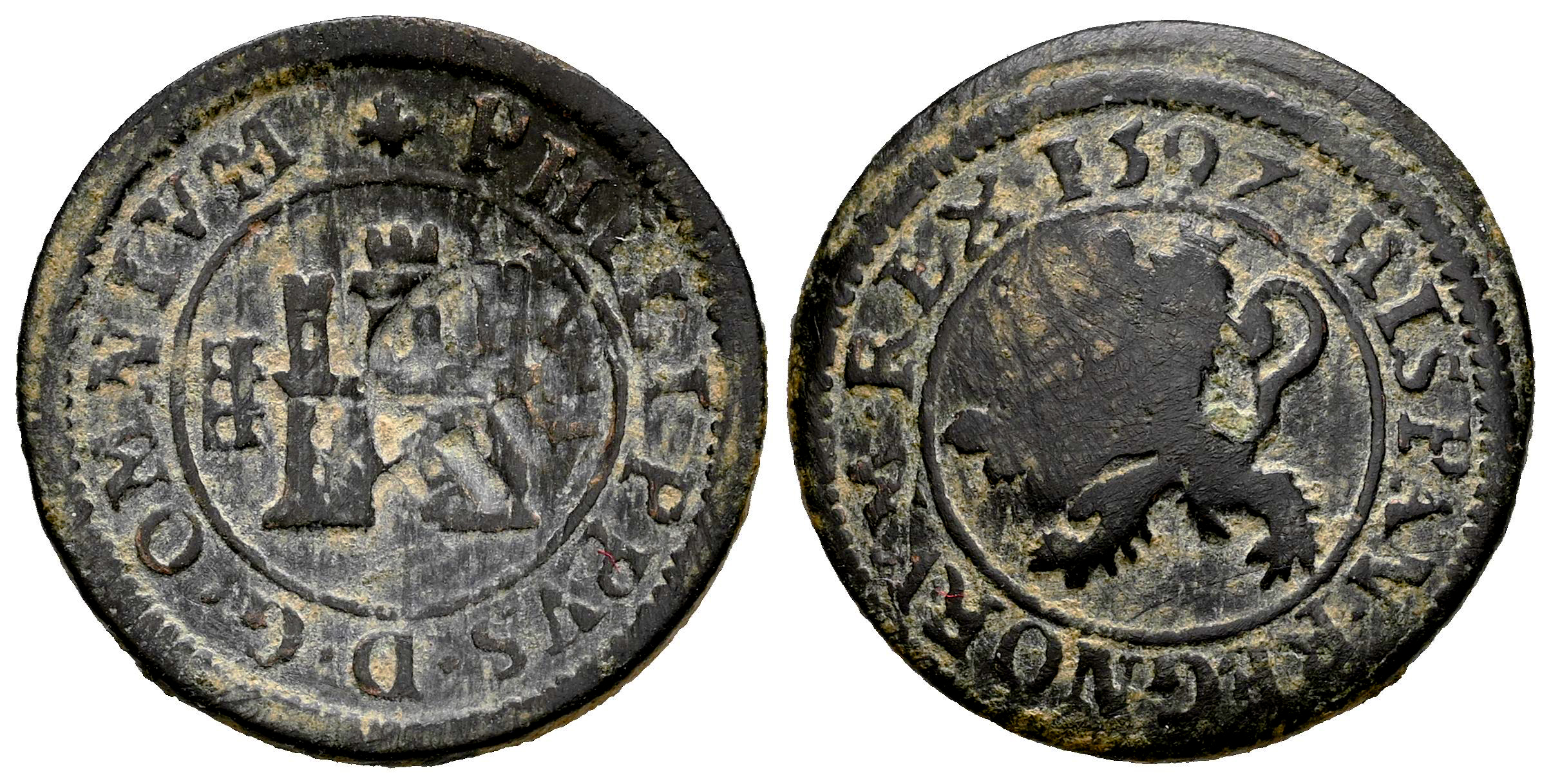 Felipe II (1556-1598). 2 maravedís. 1597. Segovia. (Cal-88). Ve. 3,46 g. Muy rara con valor y marca de ceca. Resellada en 1602-03. MBC+. Est...200,00.