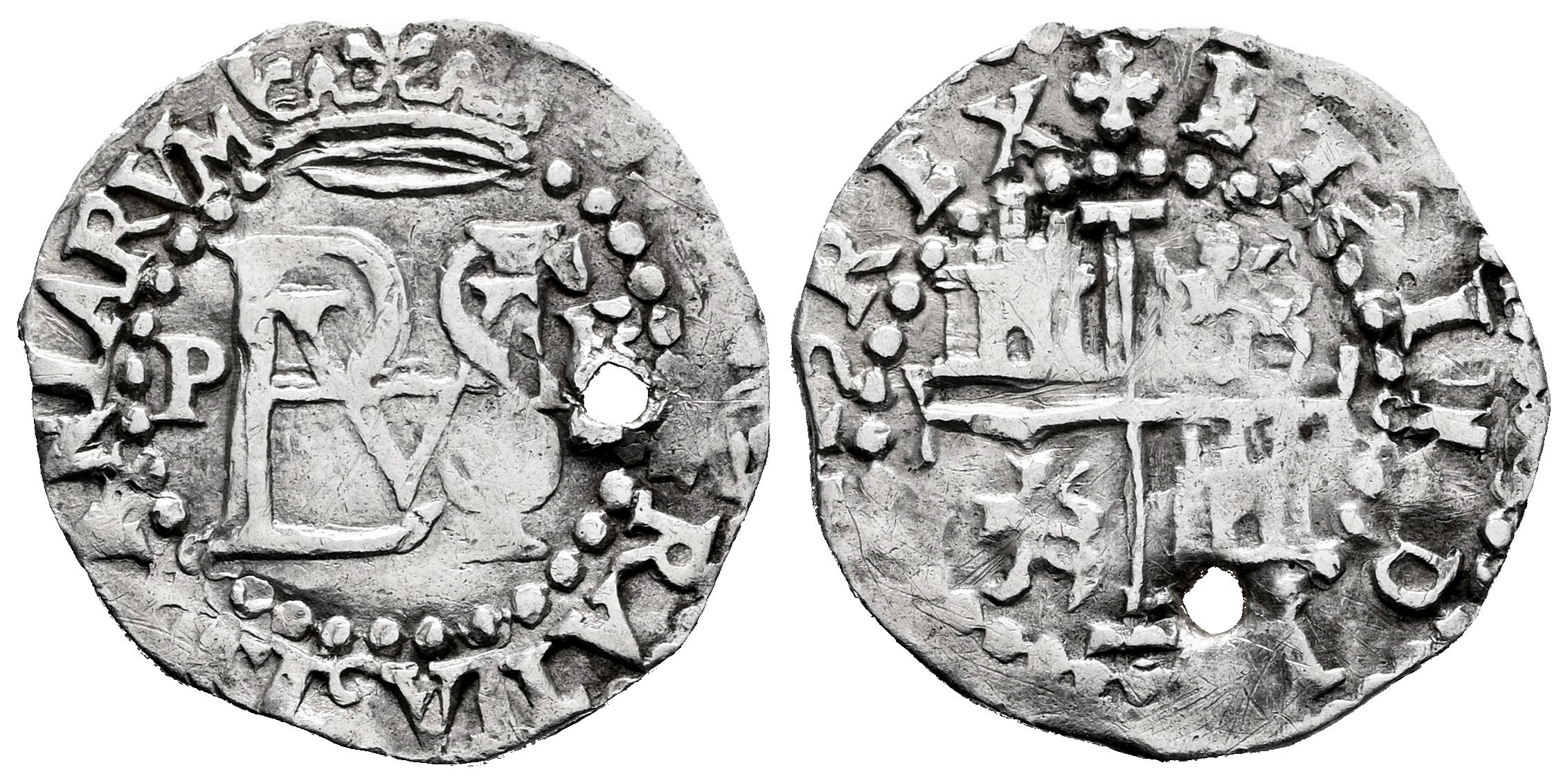 Felipe II (1556-1598). 1/2 real. ND (1574-1576). Lima. P-R. (Cal-135). Ag. 1,58 g. Monograma entre P-R. Perforación. Escasa. MBC+. Est...150,00.